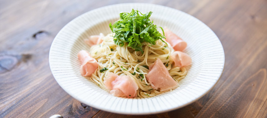 バジルではなく、大葉を使った「しそベーゼ」をご紹介。さっぱりとした冷製そうめんに、生ハムの塩気がいいアクセントになりそうです。暑い日や、いつもとは違うそうめんを楽しみたいときにおすすめです。