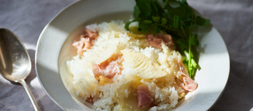 材料を入れたら炊飯器で炊くだけ、とっても簡単につくれるピラフのレシピです。味つけはシンプルですが、炊き上げたあとに入れる生ハムの風味で、ちょうどいい塩加減に仕上がります。