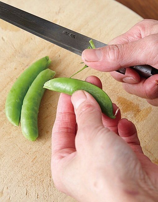 スナップえんどうは筋を取る。にんにくはつぶす。玉ねぎは幅1.5cmのくし形切りにする。豚肉は幅4cmに切る。