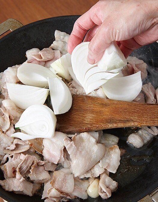 フライパンに、にんにく、ごま油を入れ、中火にかける。香りが立ったら豚肉を入れて炒め、焼き色がついたら玉ねぎを加え、ざっと炒める。