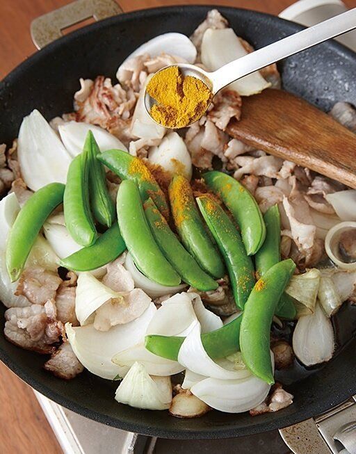 スナップえんどう、酒、カレー粉小さじ1の順に加えて混ぜ、ふたをして弱火で5分蒸し焼きにする。中火に戻し、[A]を加えて炒める。器に盛り、好みでカレー粉をふる。