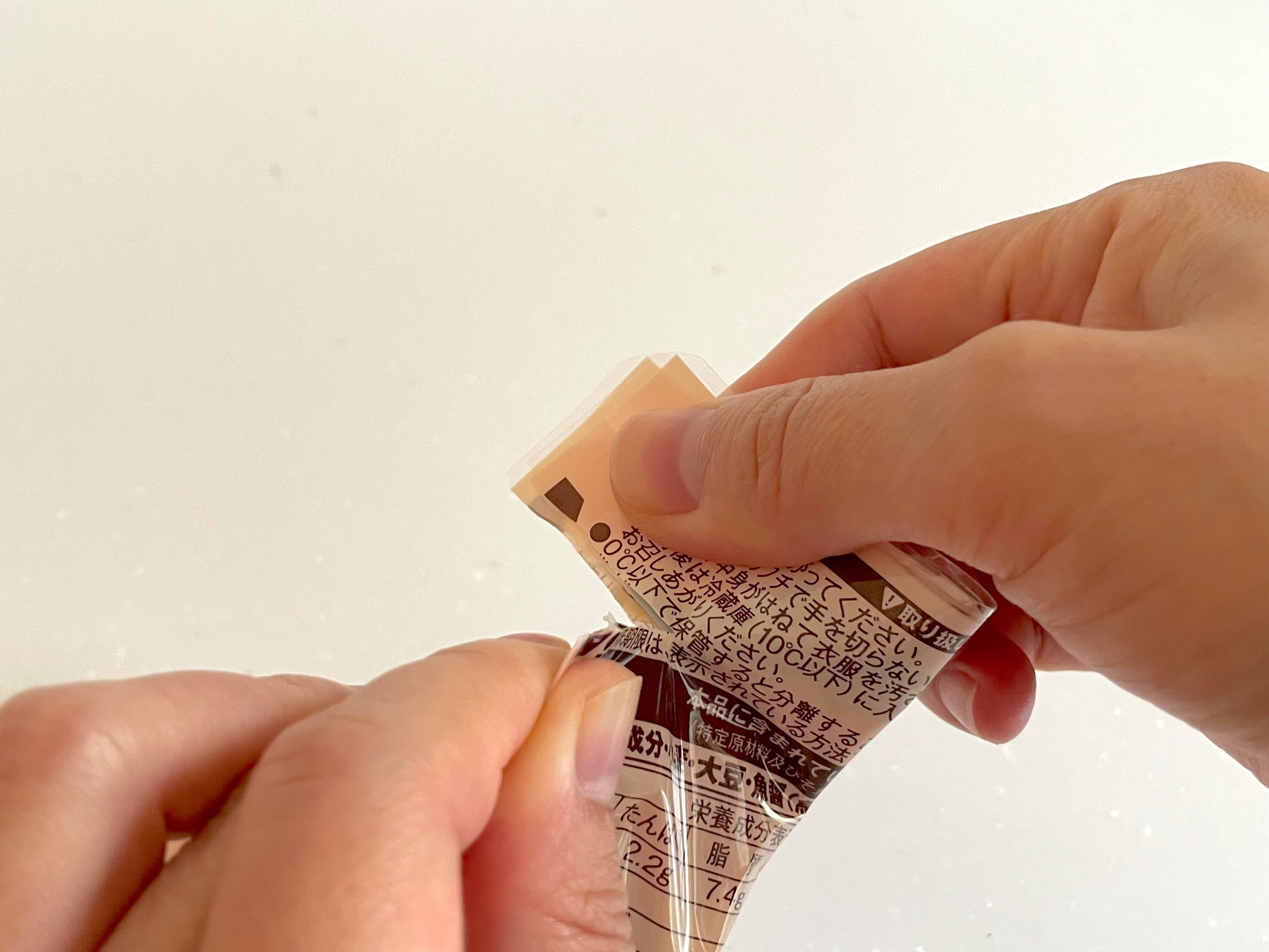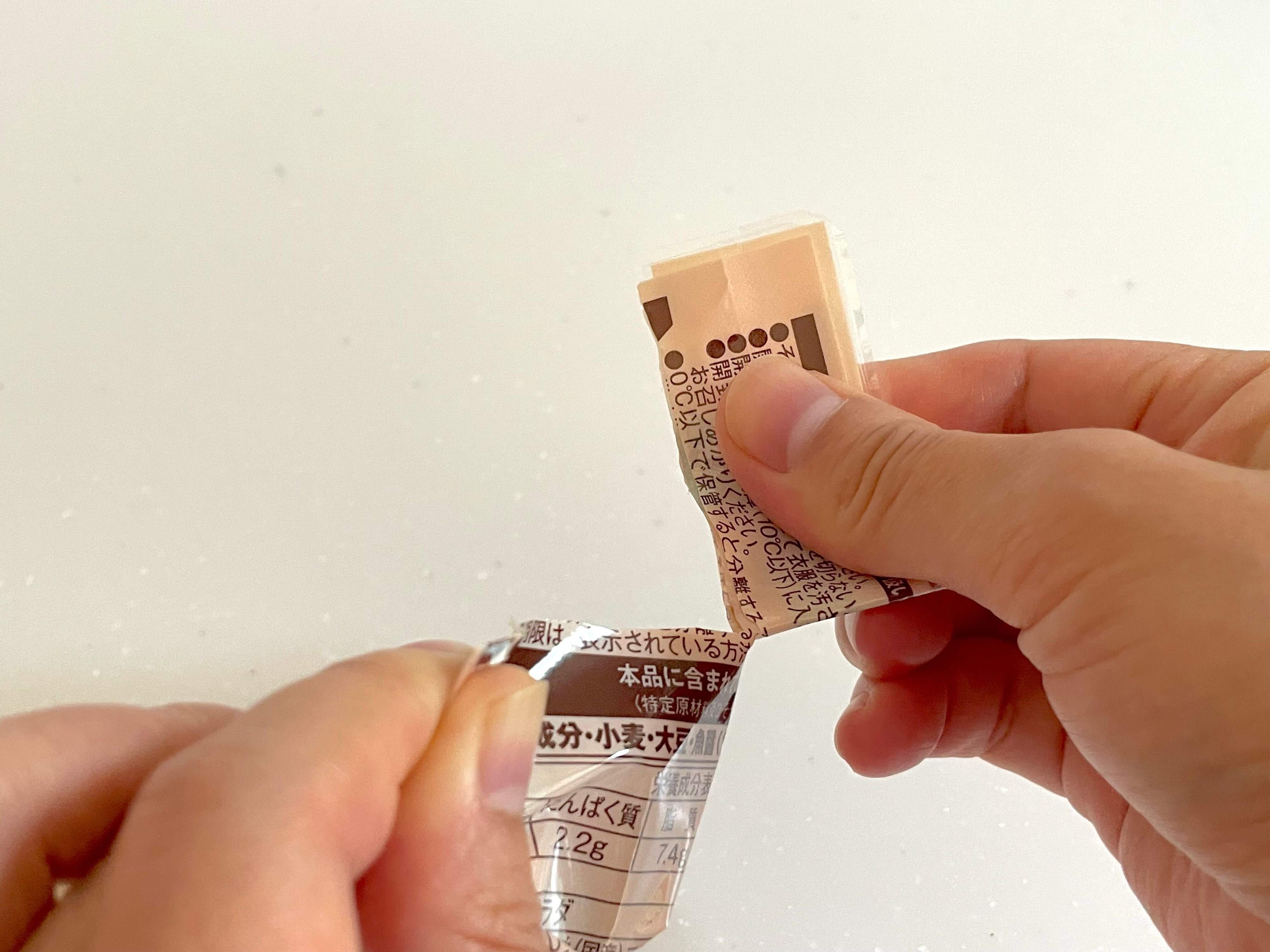 (2) パウチが重なったまま、通常の要領で切り口から開けていきます。