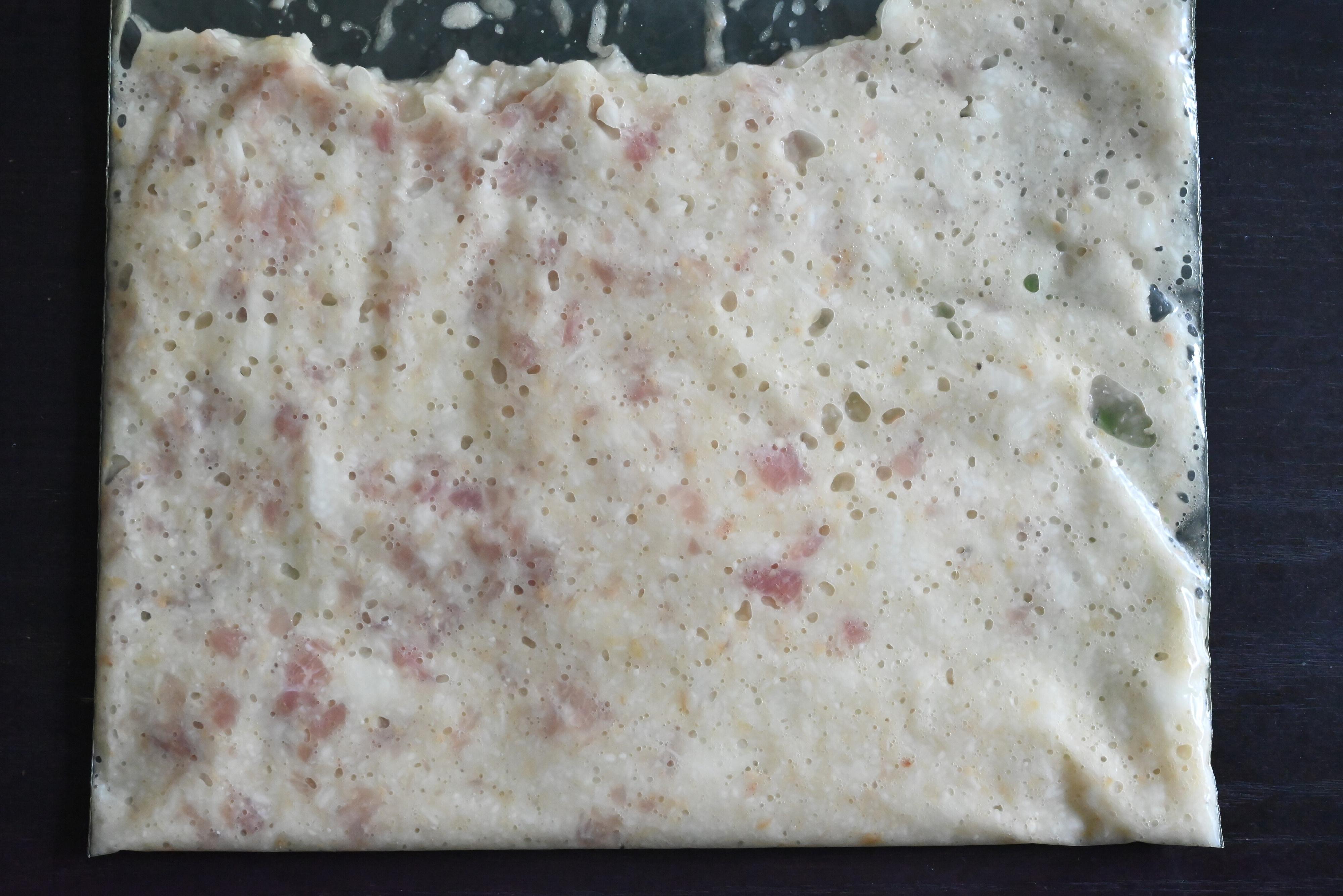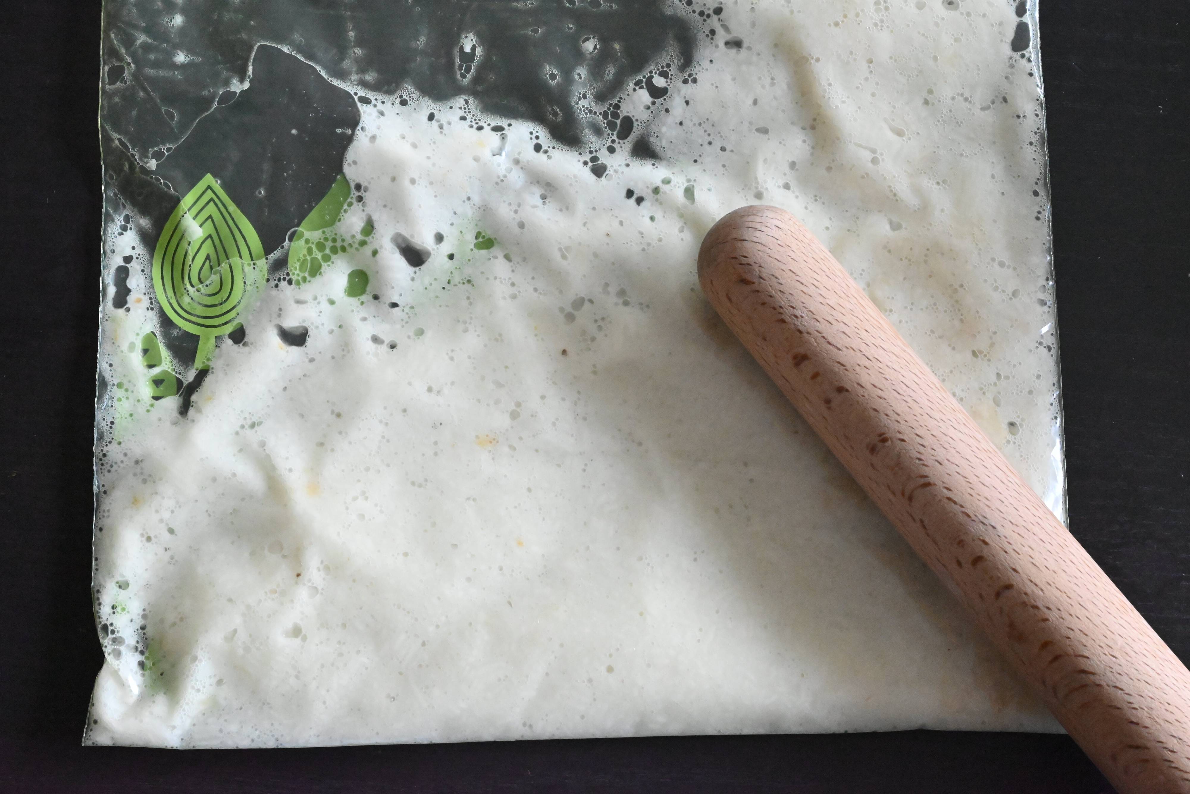 (1)長芋は皮を剥き、食品用ポリ袋に入れ、叩いてとろろ状にする。
