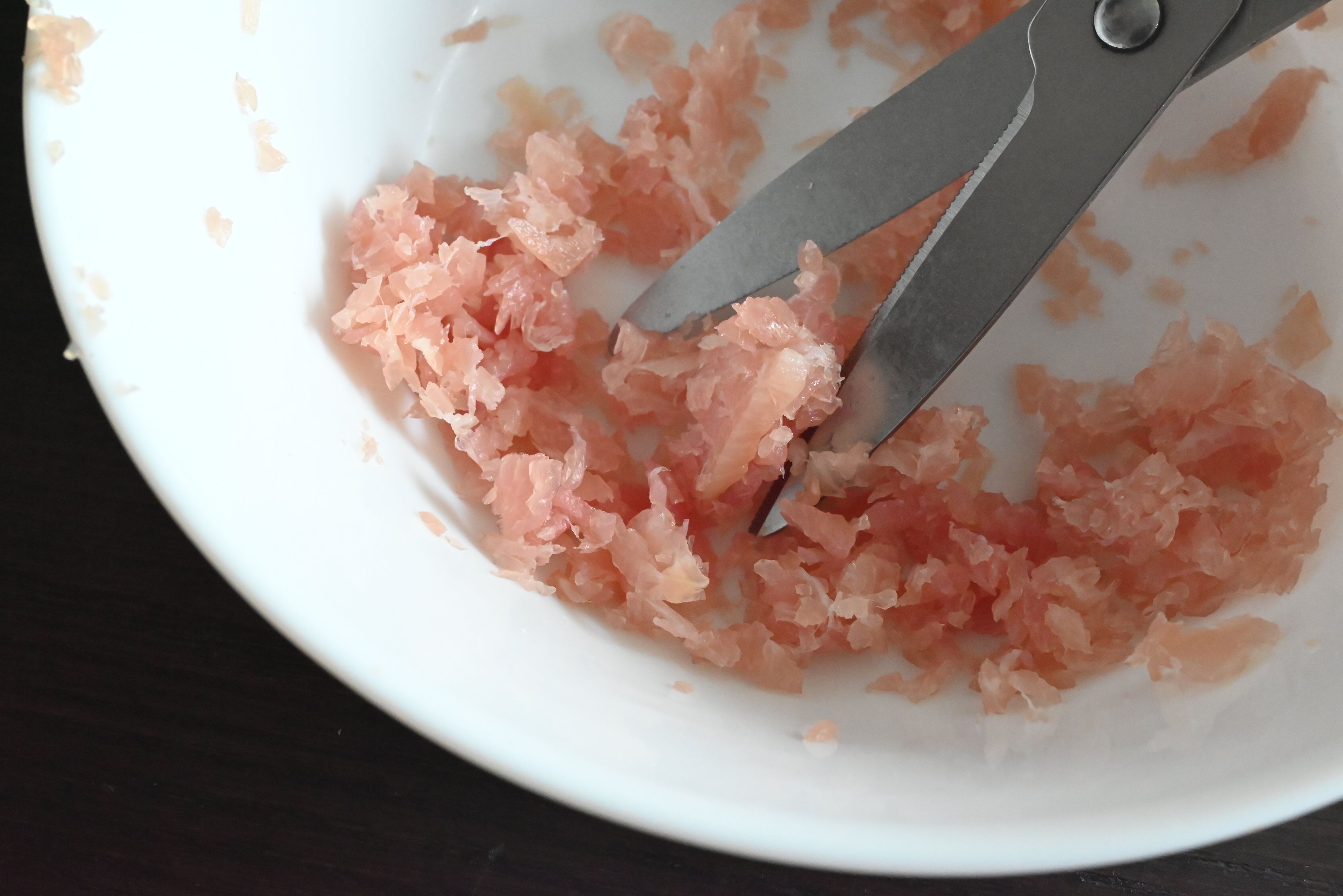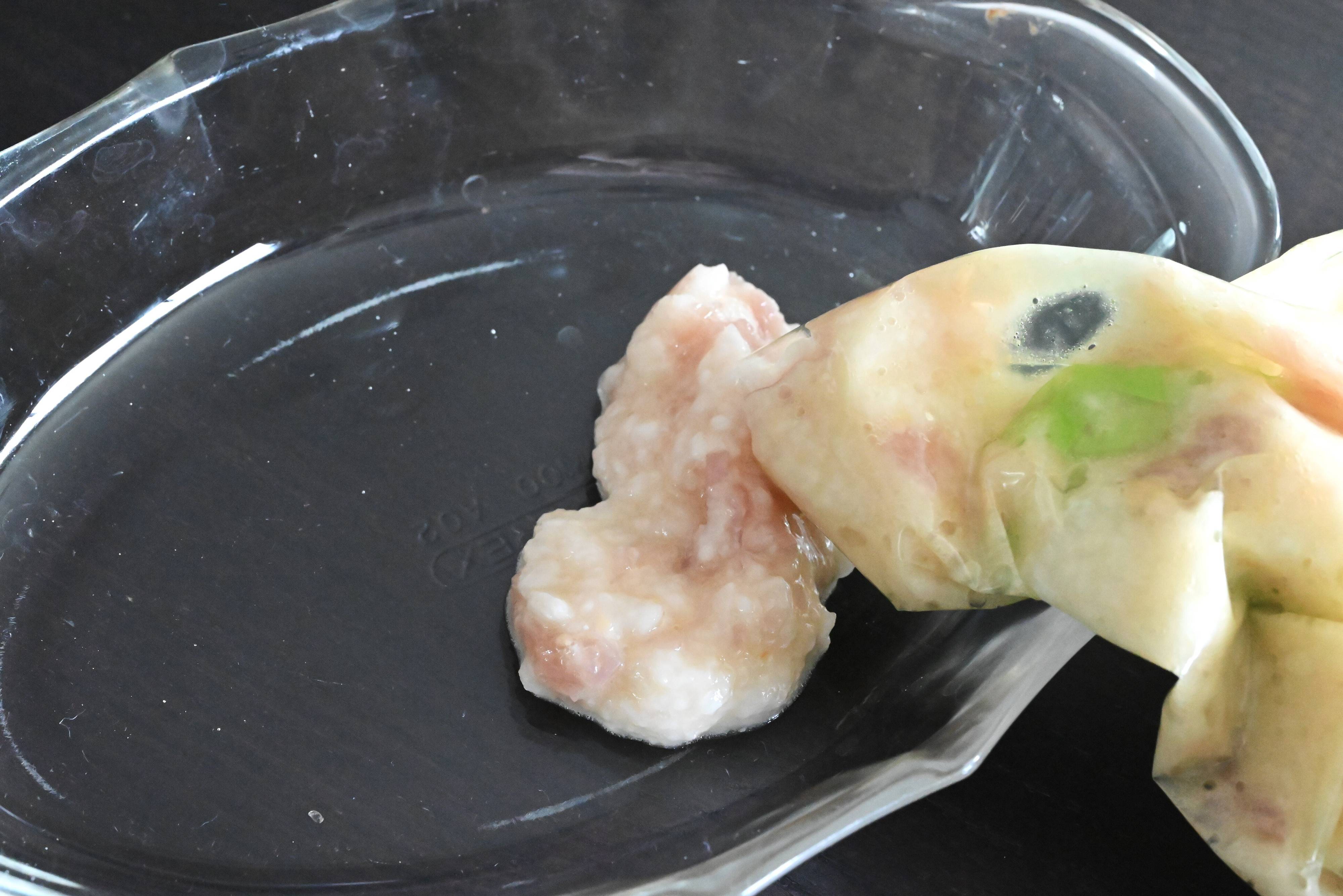 (3)(1)の袋に生ハム、ごま油、みそを入れてよく揉みこむ。