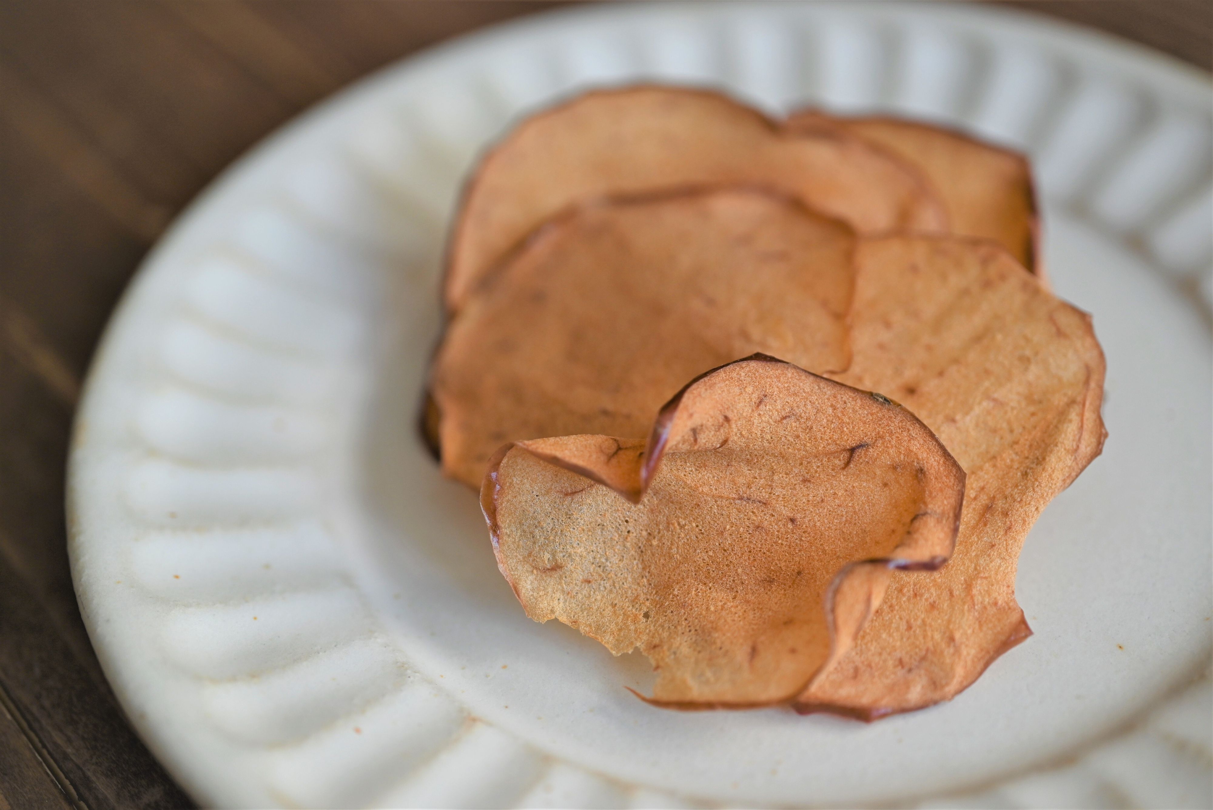 低温のオーブンで加熱したりんごは、甘味が凝縮されたパリパリのチップスに♪