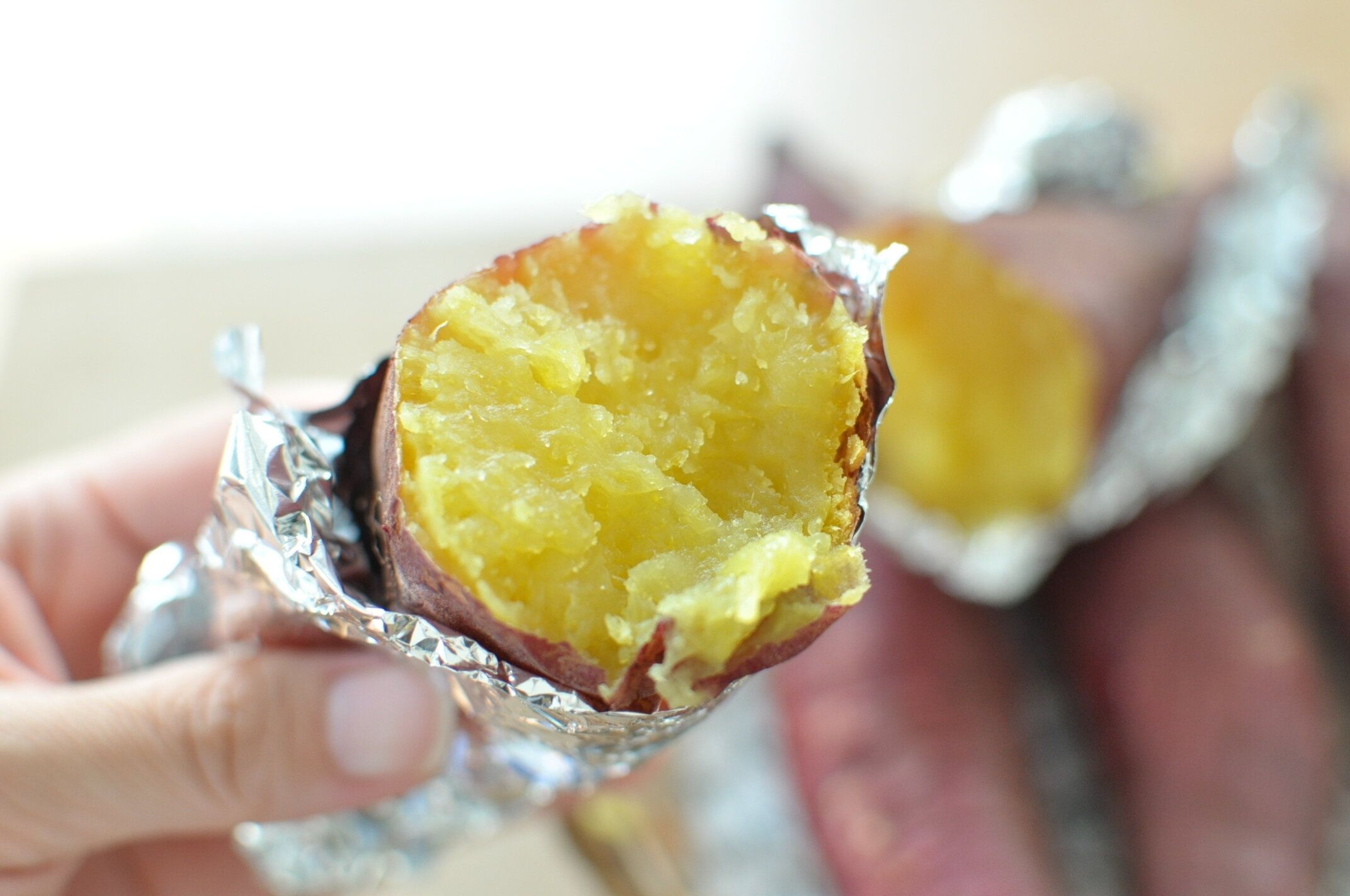 この酵素が作用する温度が70℃前後なので、実は焼き芋を作るときはこの低温状態をできるだけ長くキープするのが重要。オーブンは予熱無しの低温でじっくり時間をかけて(1~2時間!)焼くことで、ねっとり甘い焼き芋ができます。