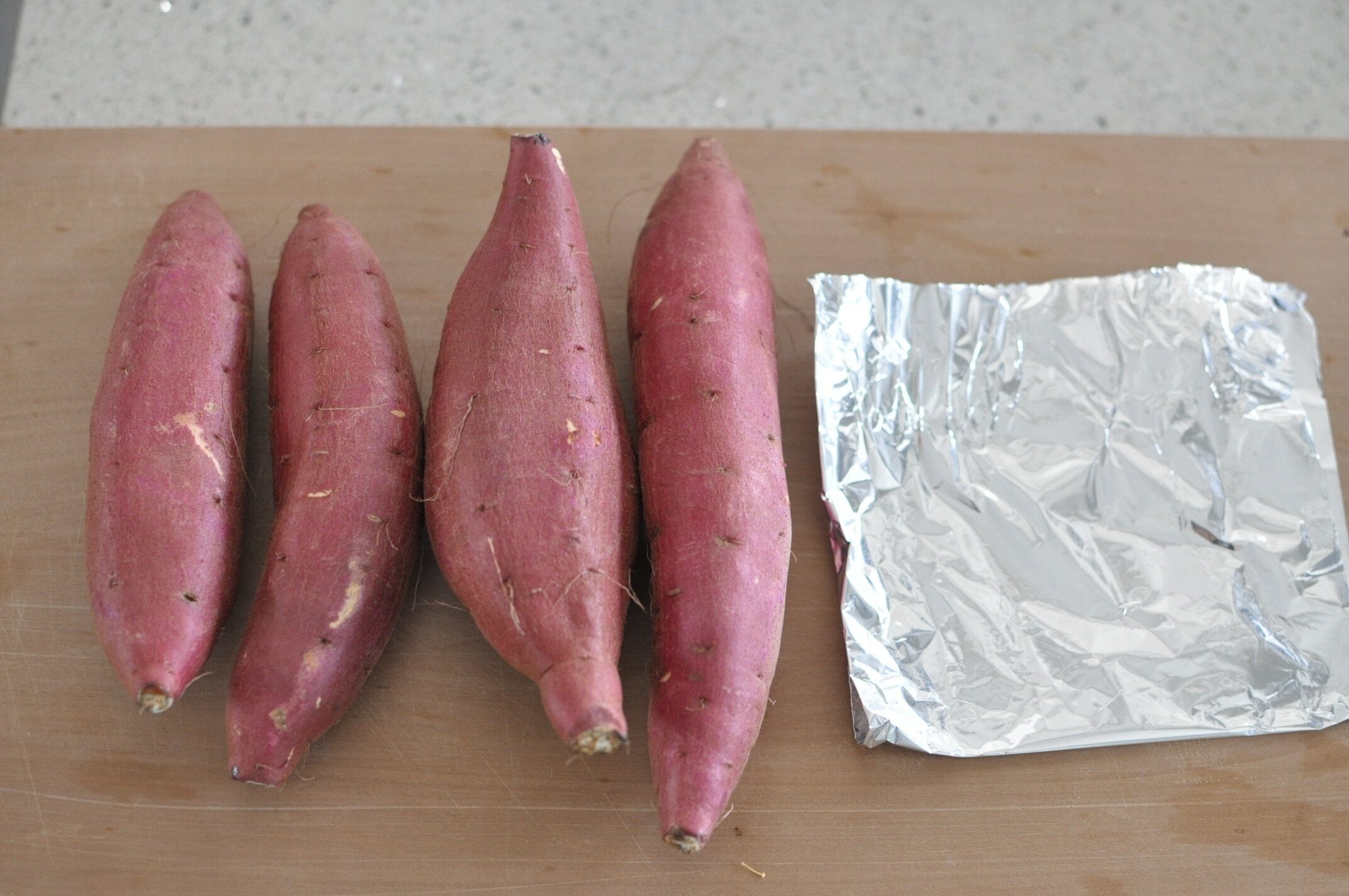 特別甘い品種でなくても大丈夫。今回は1本200gほどの中サイズ4本を焼きます。