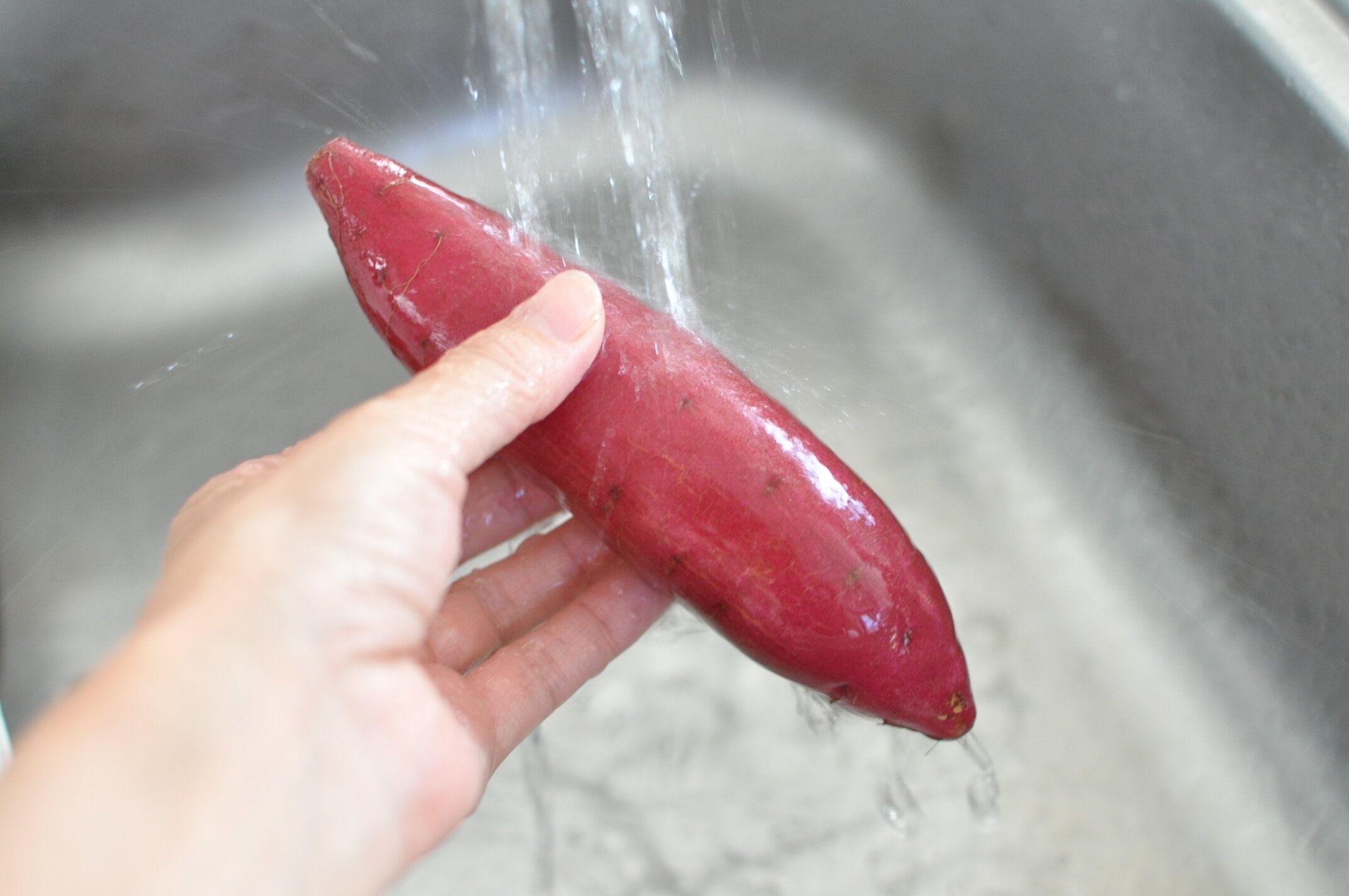 さつまいもを水で洗います。汚れを落とすため、そして表面に水気を含ませるための作業です。