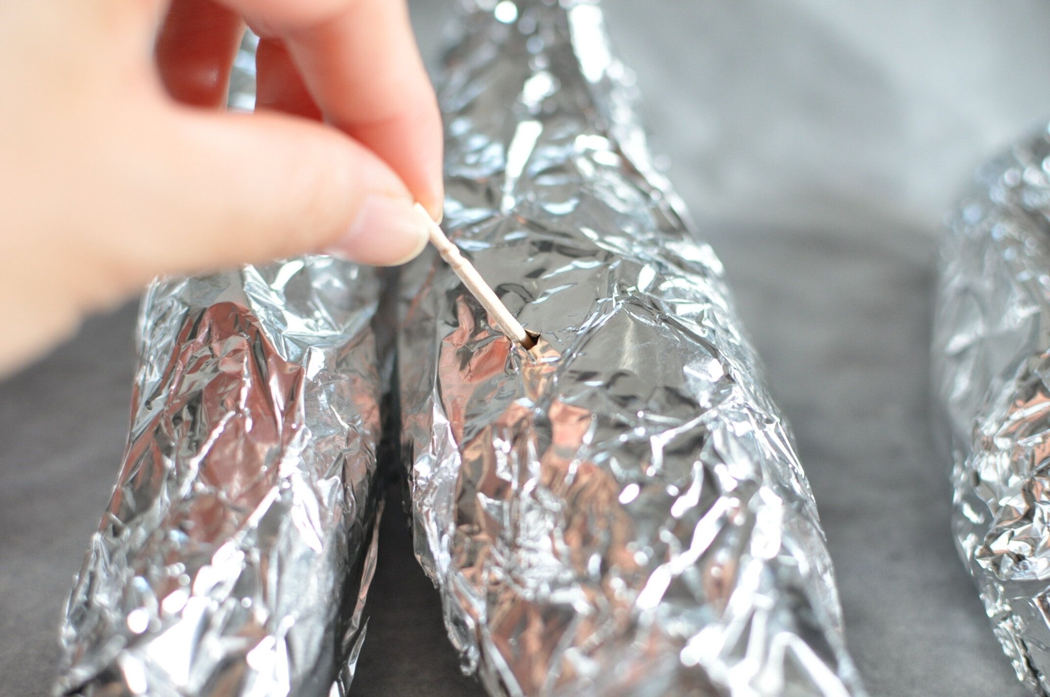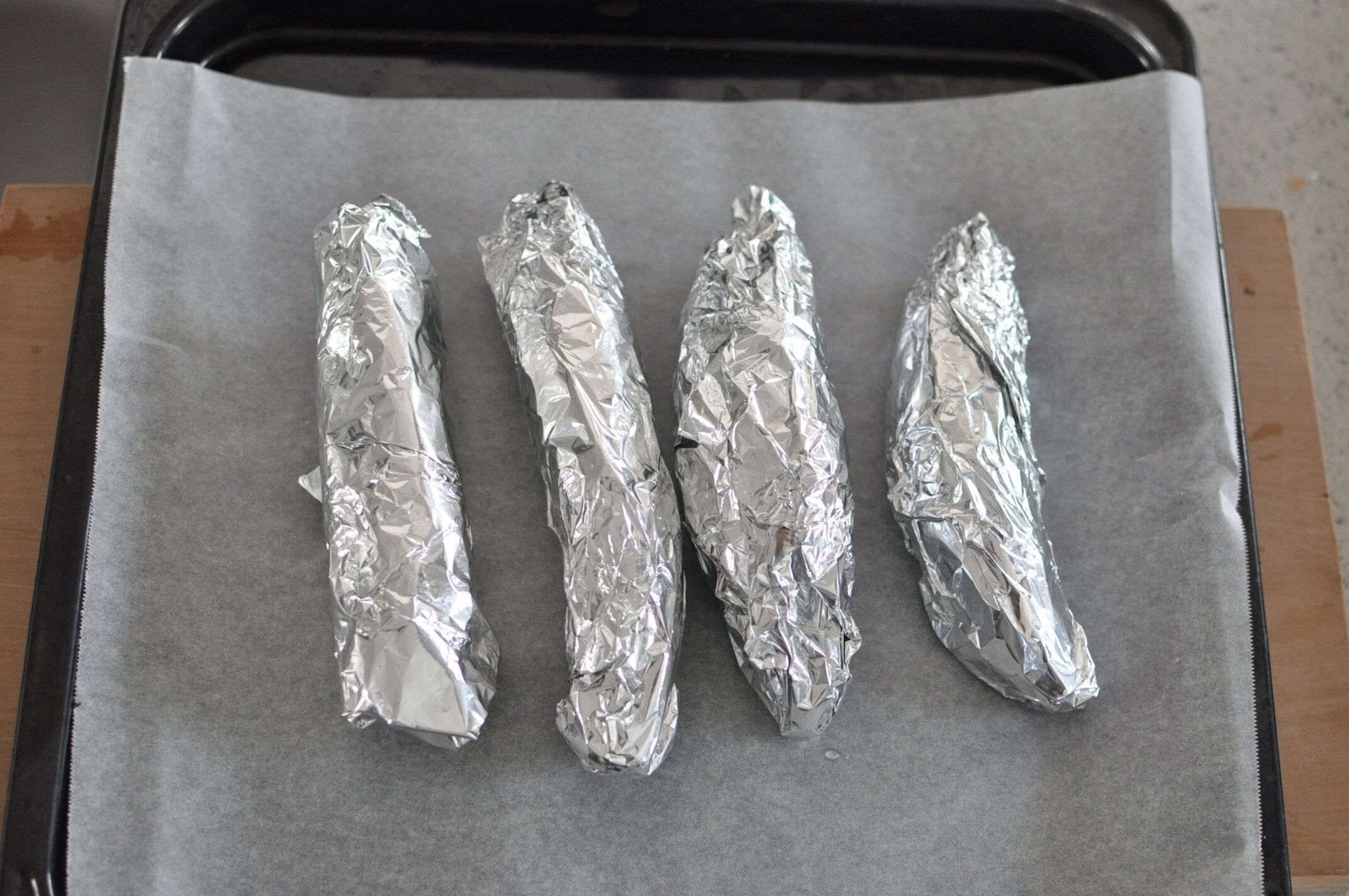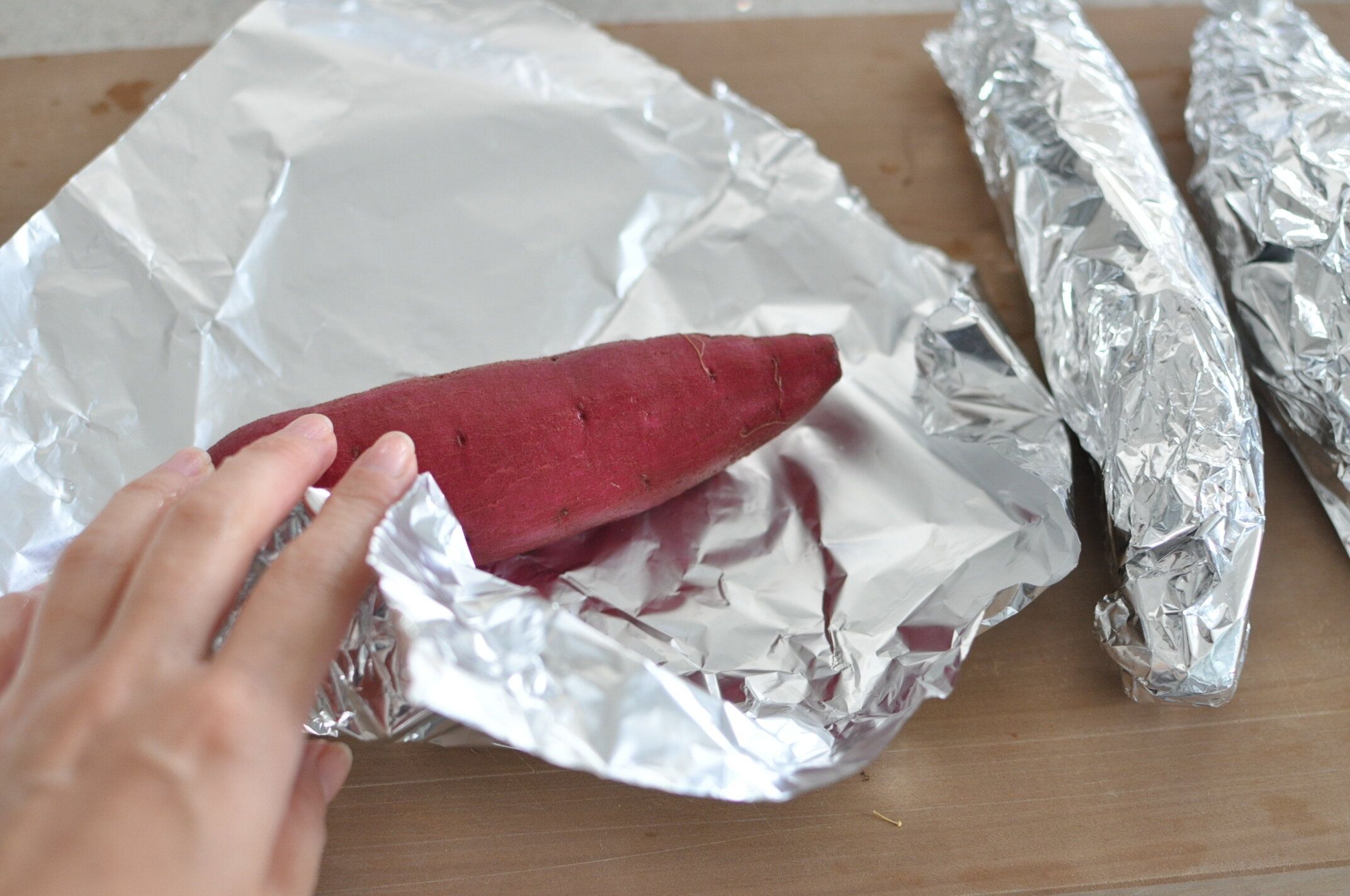 濡れたままのさつまいもを、アルミホイルで包みます。