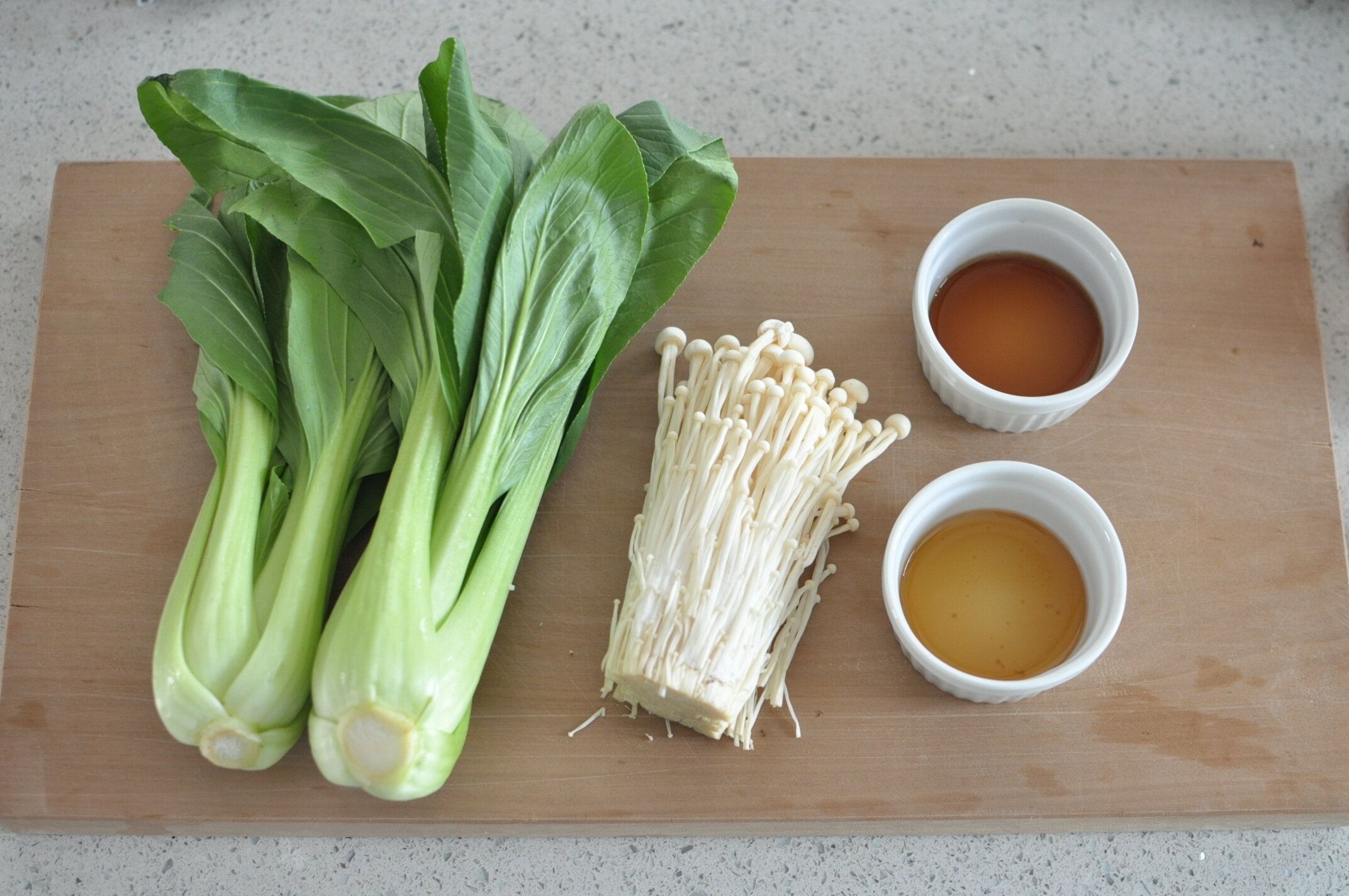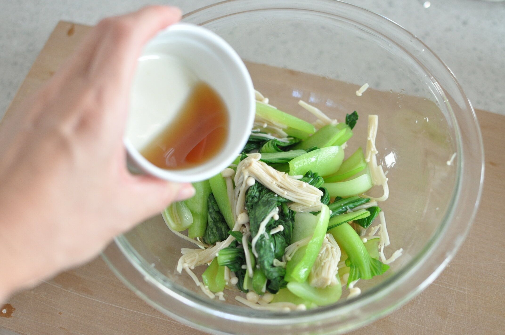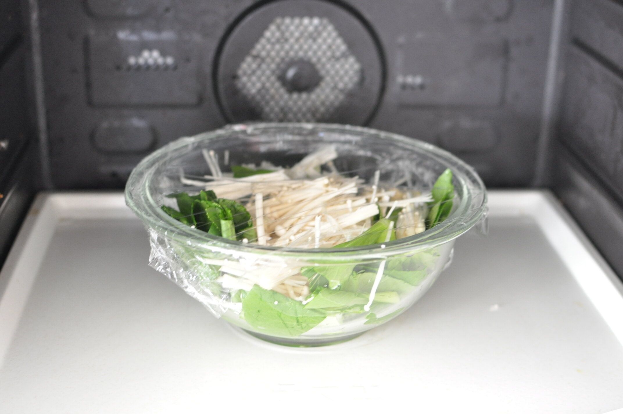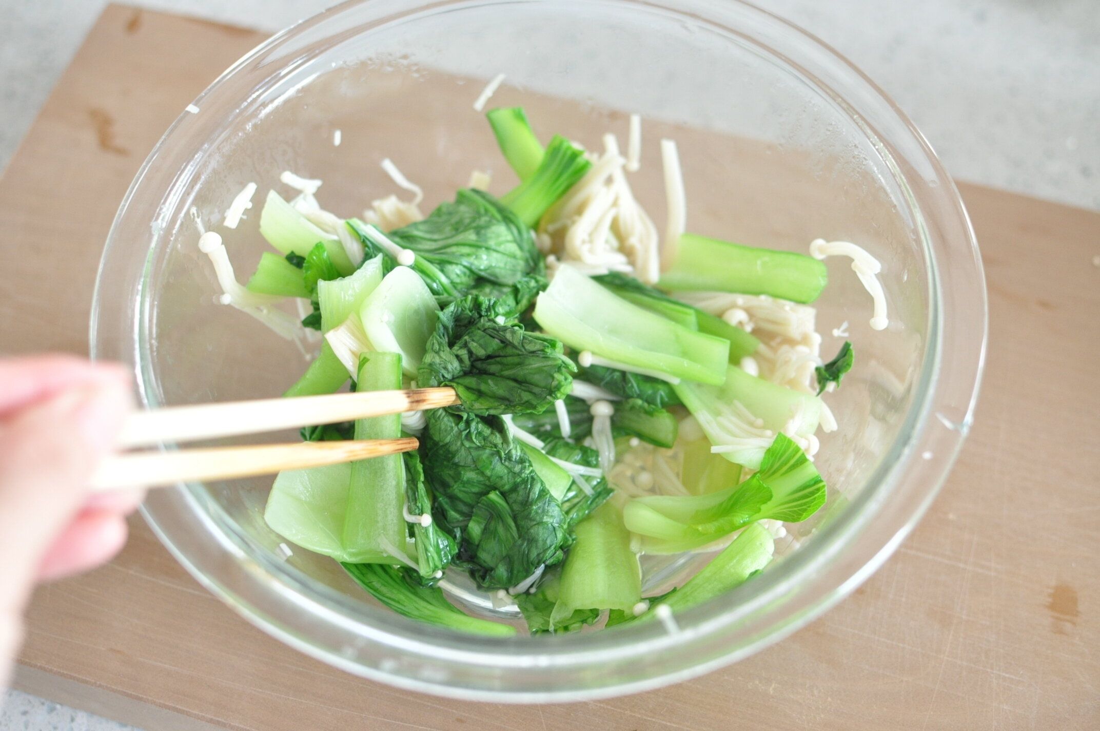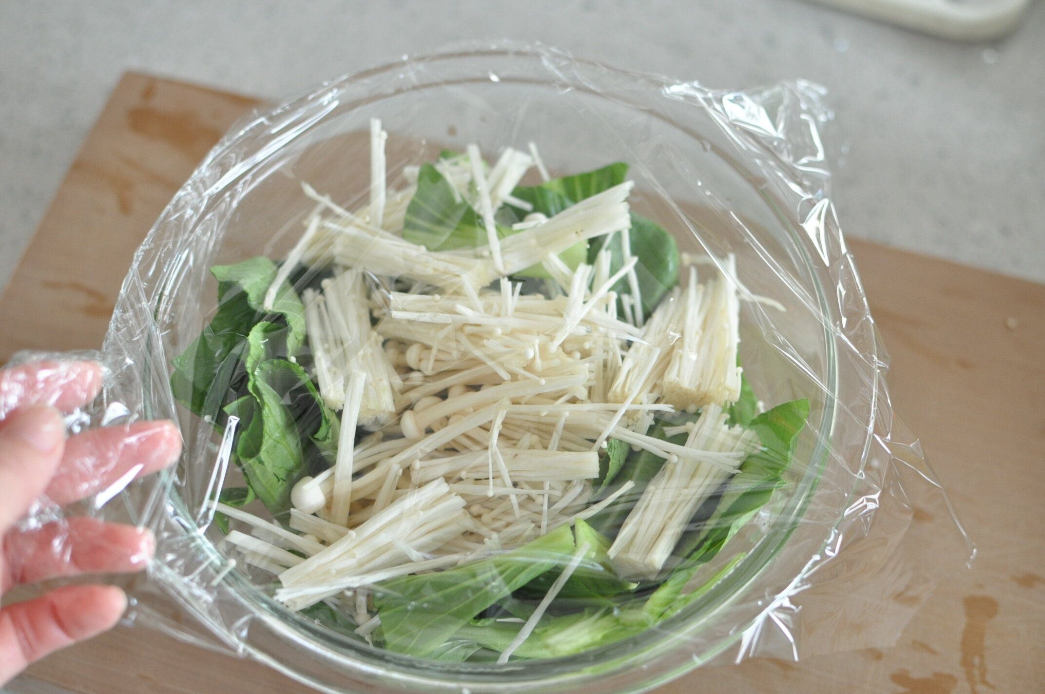 耐熱ボウルにチンゲン菜を入れて洗い、ざっくり水気を切ります。上に手でほぐしたえのきをのせて、ふんわりラップをかけます。