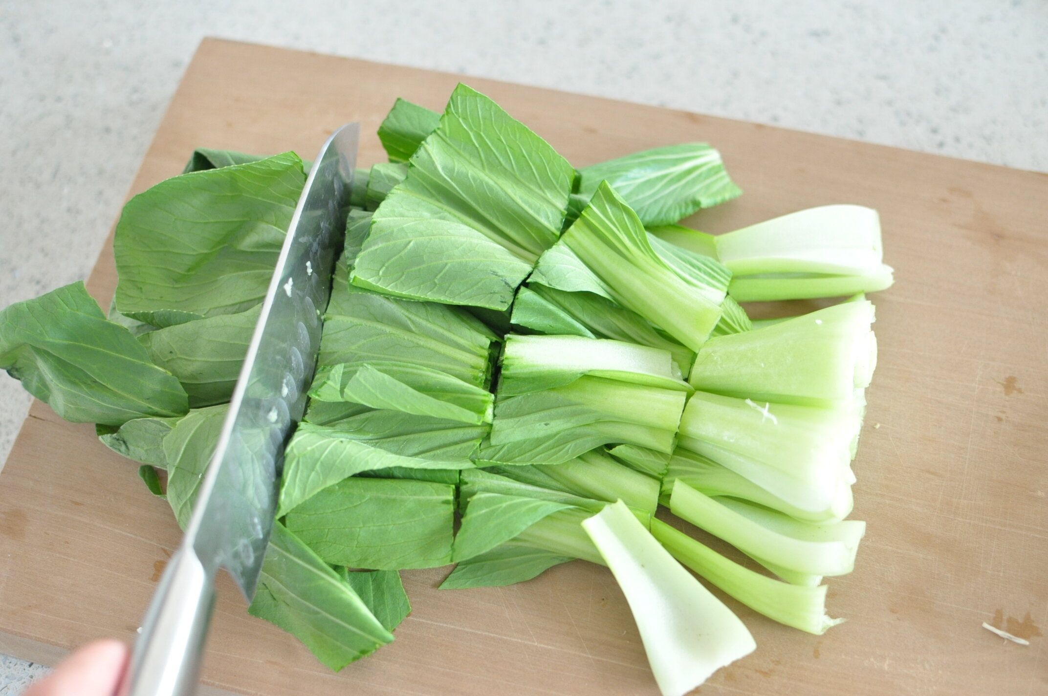 チンゲン菜の根元を切り落とし、残りを4つにザクザク切ります。