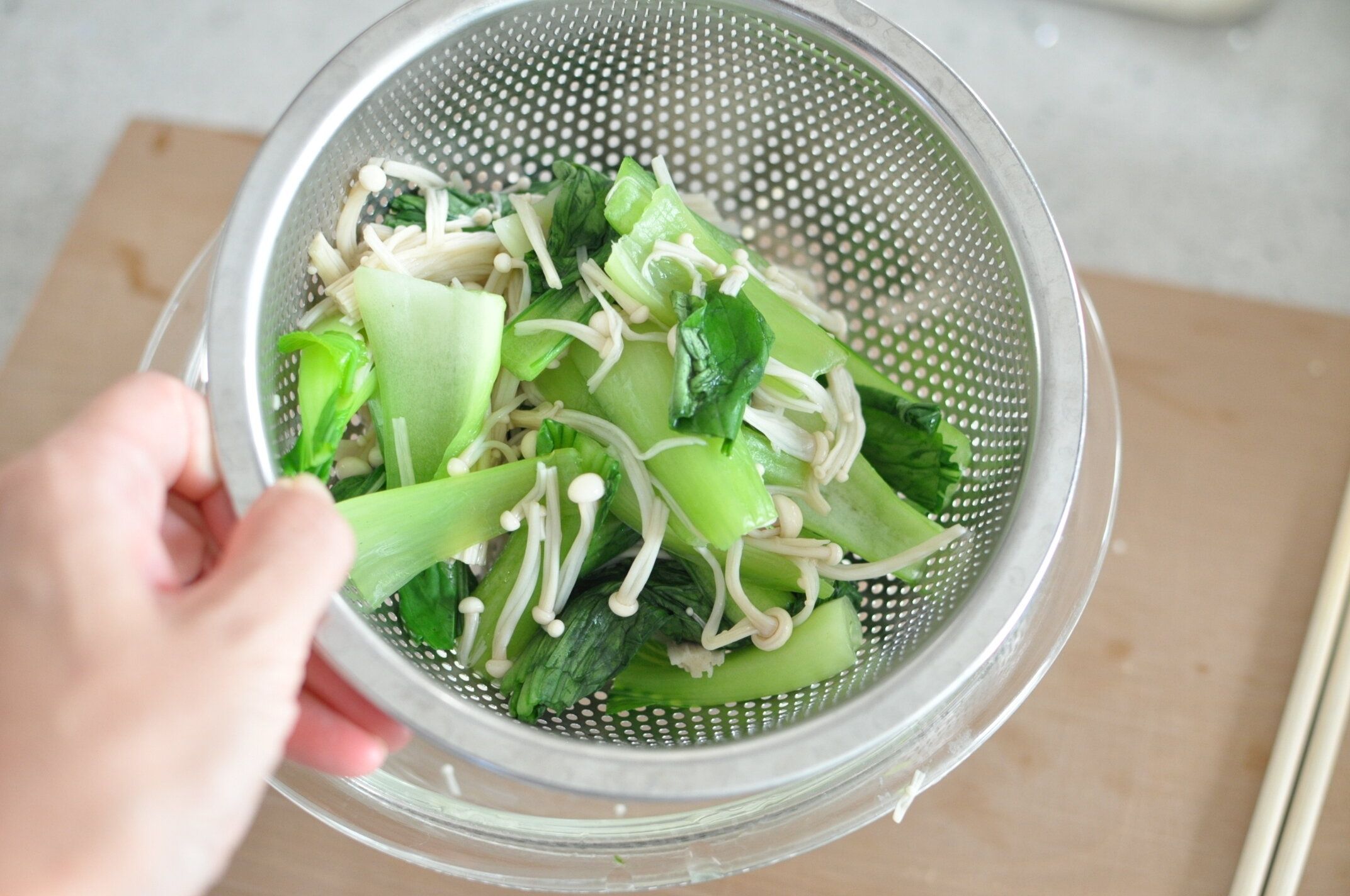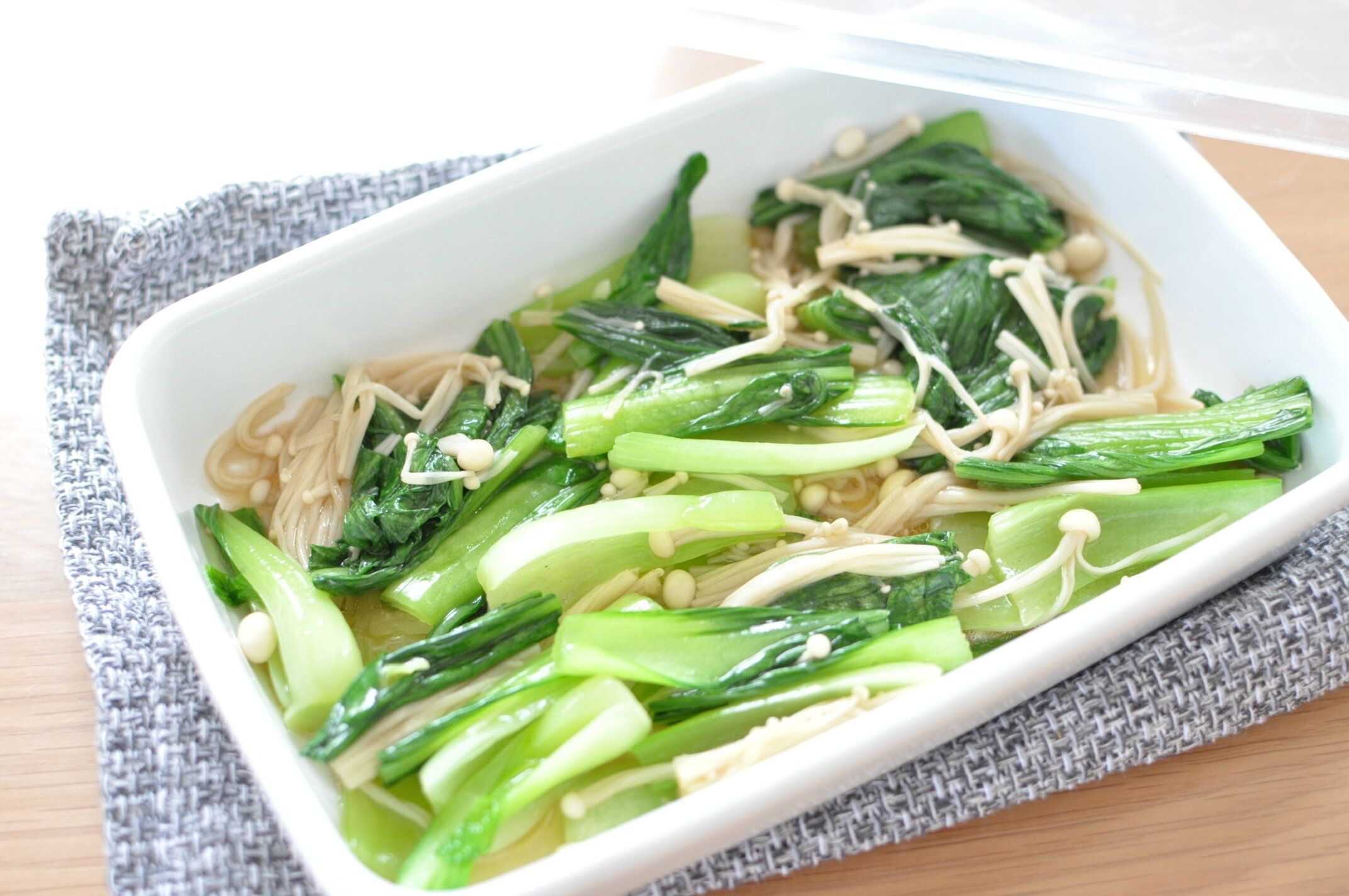チンゲン菜は茎の部分が肉厚で味が馴染みにくいのですが、その分加熱してもシャキシャキ感が残るのが特徴です。えのきや葉の部分にしっかりと味が馴染むので、茎と一緒に食べるとより美味しく食べられます。