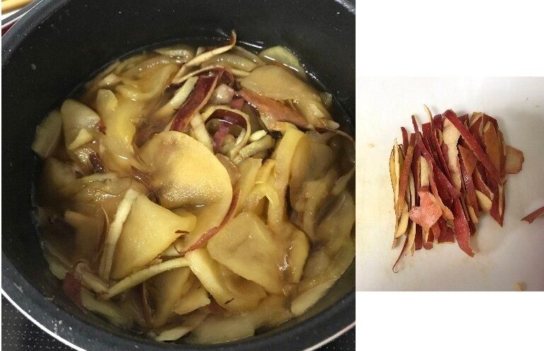 ※りんごの皮は最初から入れてしまうと色が変色してしまうため、煮込んだ後に色付けのために使用するので捨てずに取っておいてください。