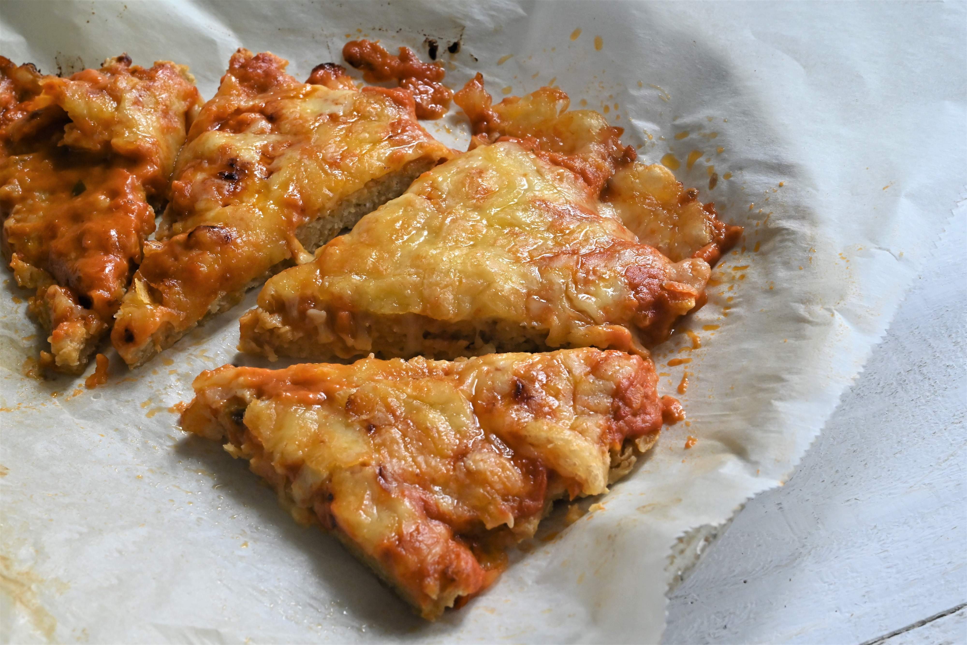 (3)クッキングシートの上に取り出し、トマトソース、ピザ用チーズを広げてのせる。