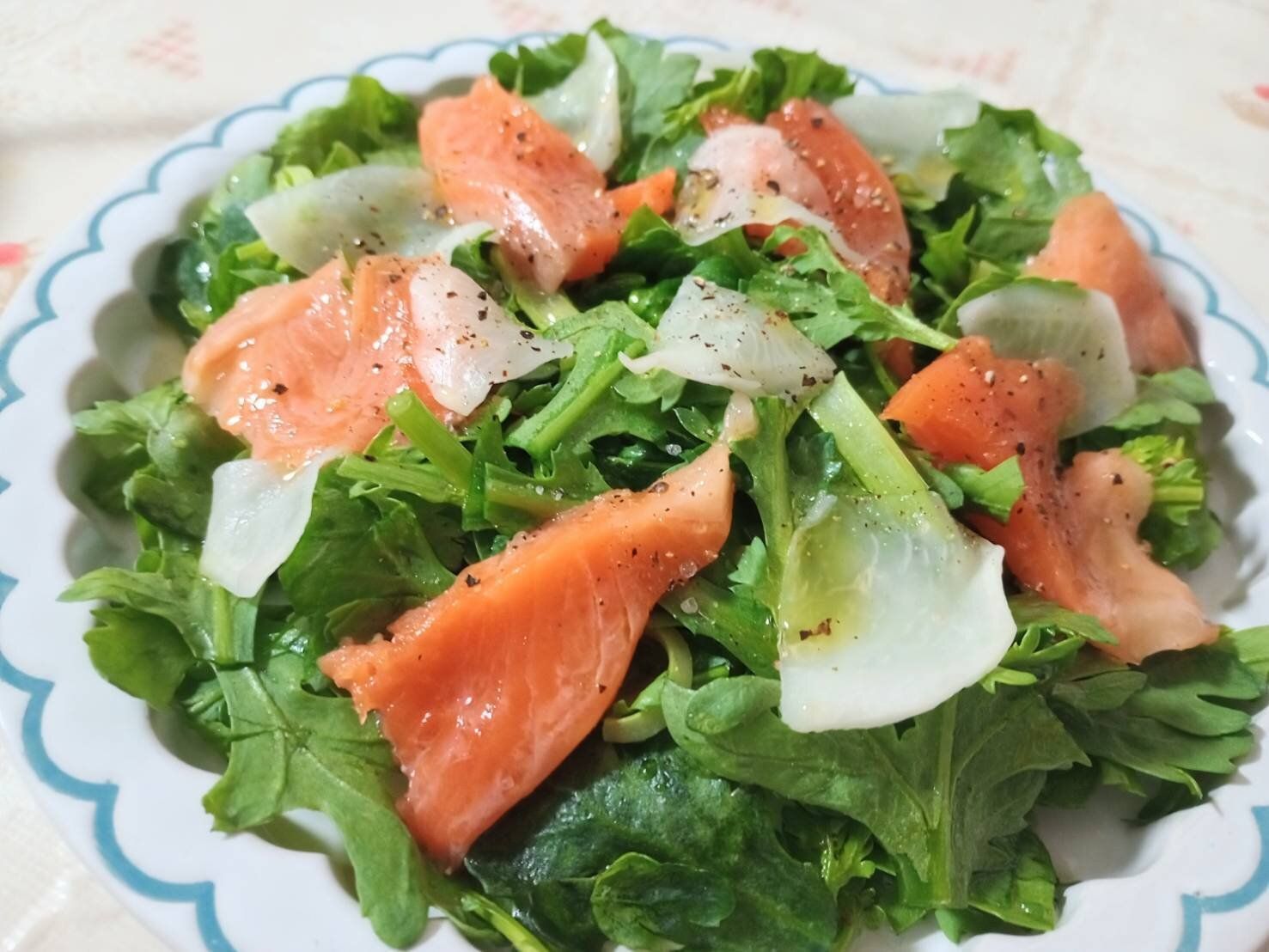春菊とサーモンとかぶのレモンドレッシングサラダ。かぶは軽く塩もみしているが、薄いスライスならそのままでもOK。かぶの代わりに、水にさらした薄切り玉ねぎでも。