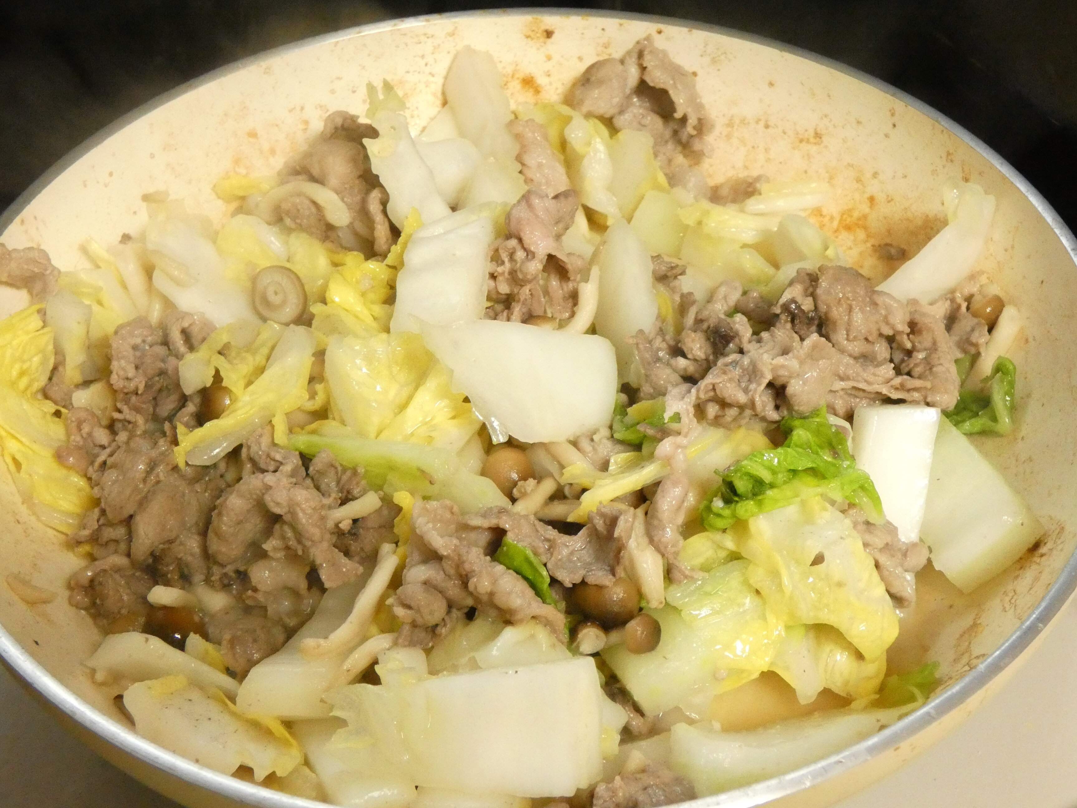 3.豚肉の色が変わってきたら白菜を入れます。白菜がしんなりしてきたら昆布茶で味つけして完成。