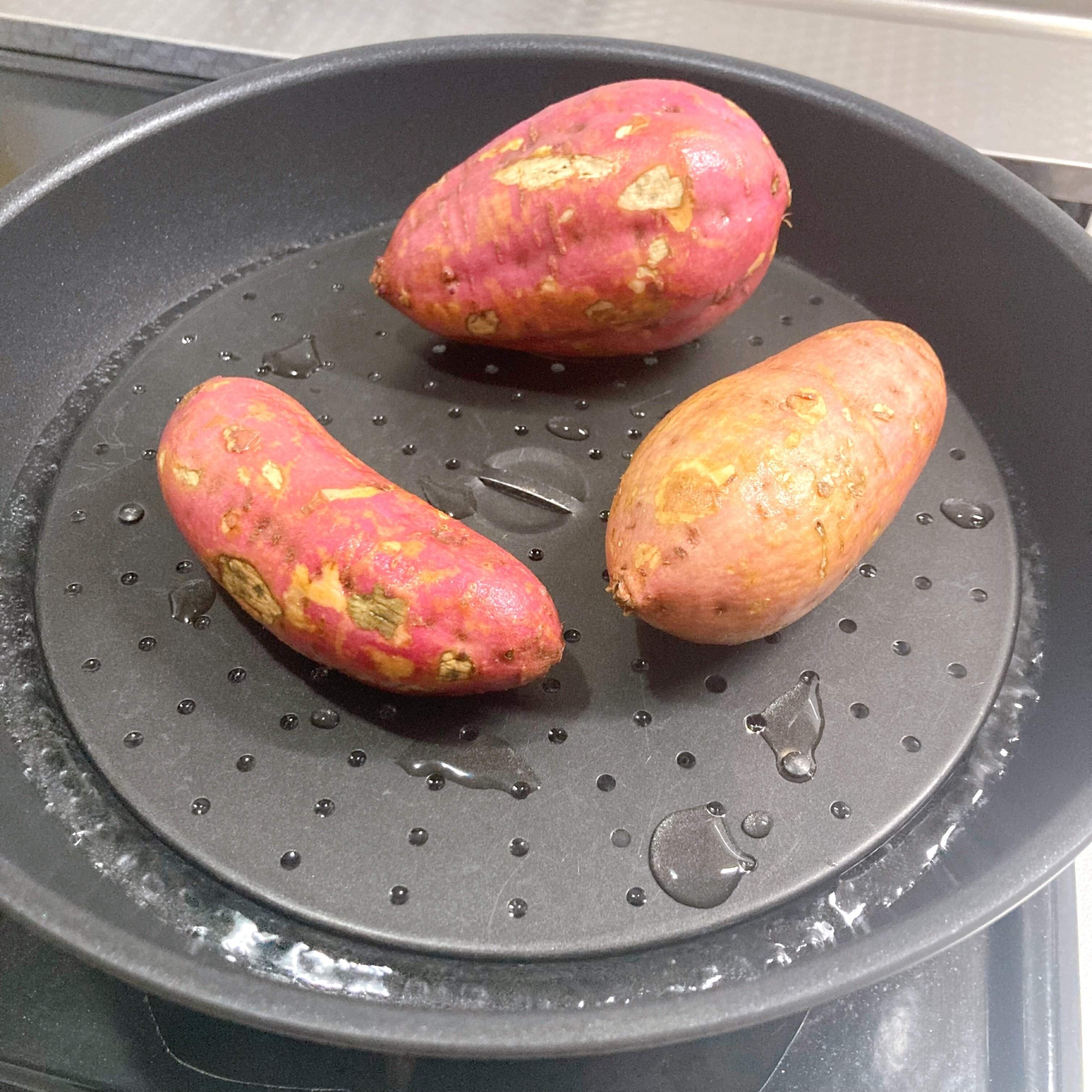 蒸し器がなくても、深めのフライパンに蒸し皿や蒸しざるをしいて、その上にサツマイモをのせます。