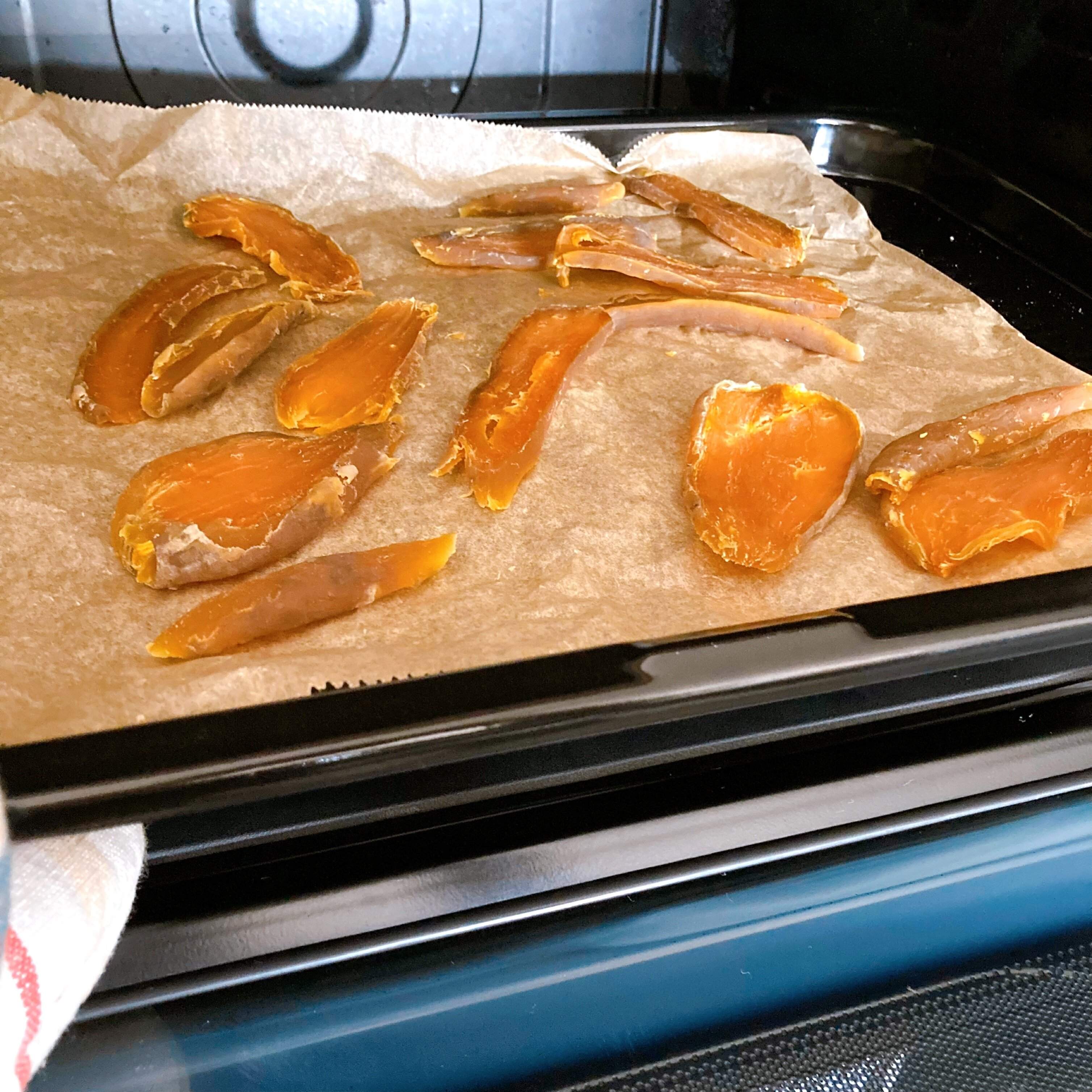 同じように準備して、天板にサツマイモを並べて、100℃に予熱したオーブンで片面1時間、裏返してさらに1時間加熱します。