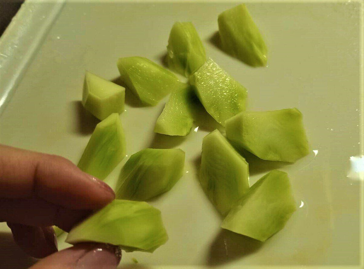 (皮の部分は、茎を回しながら側面を切り落としていって六角柱か八角柱を作るイメージでやると切りやすいです。)