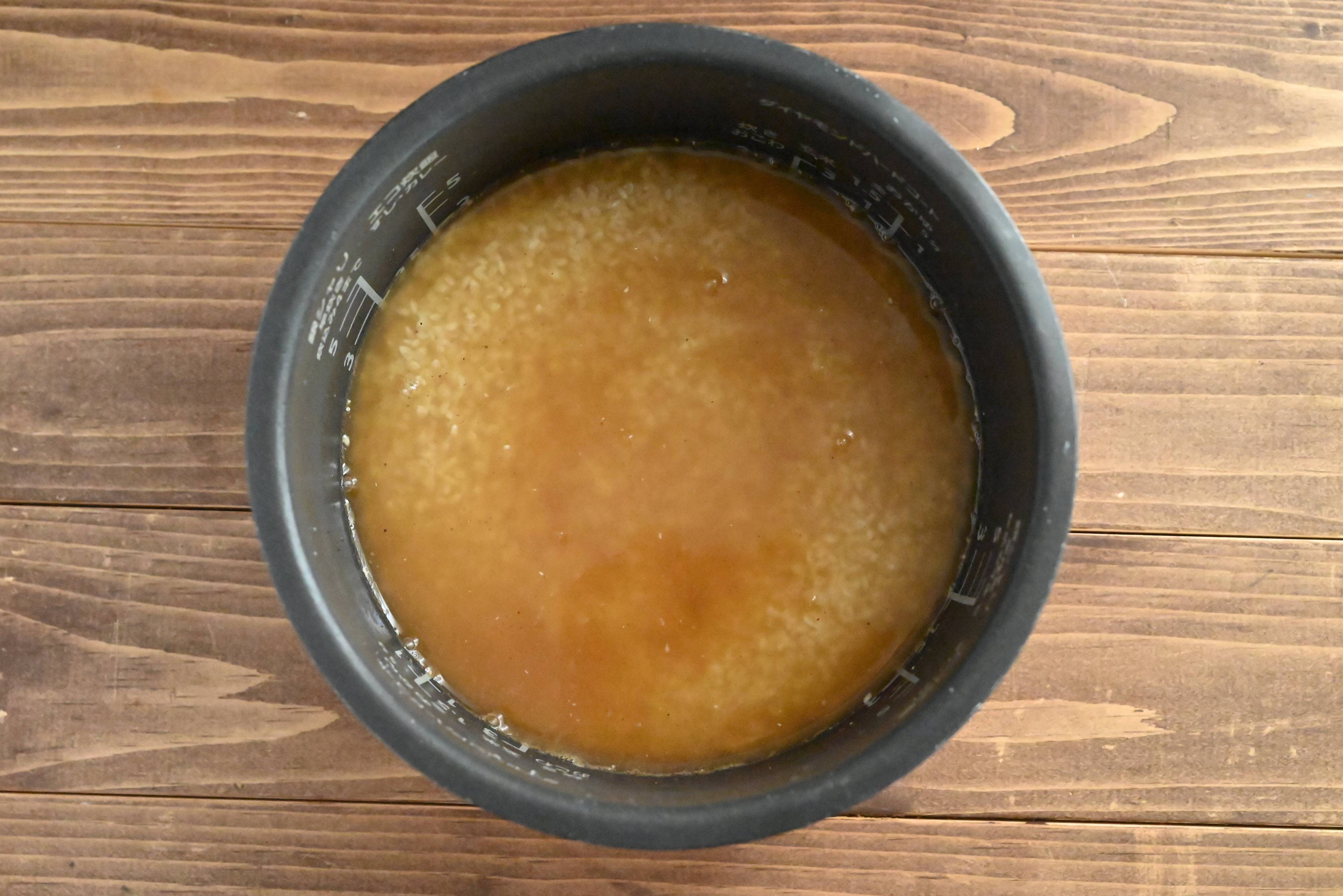 (1)米を研ぎ、めんつゆ、酒、だしの素を入れ、炊飯器のメモリまで水を入れてひと混ぜする。