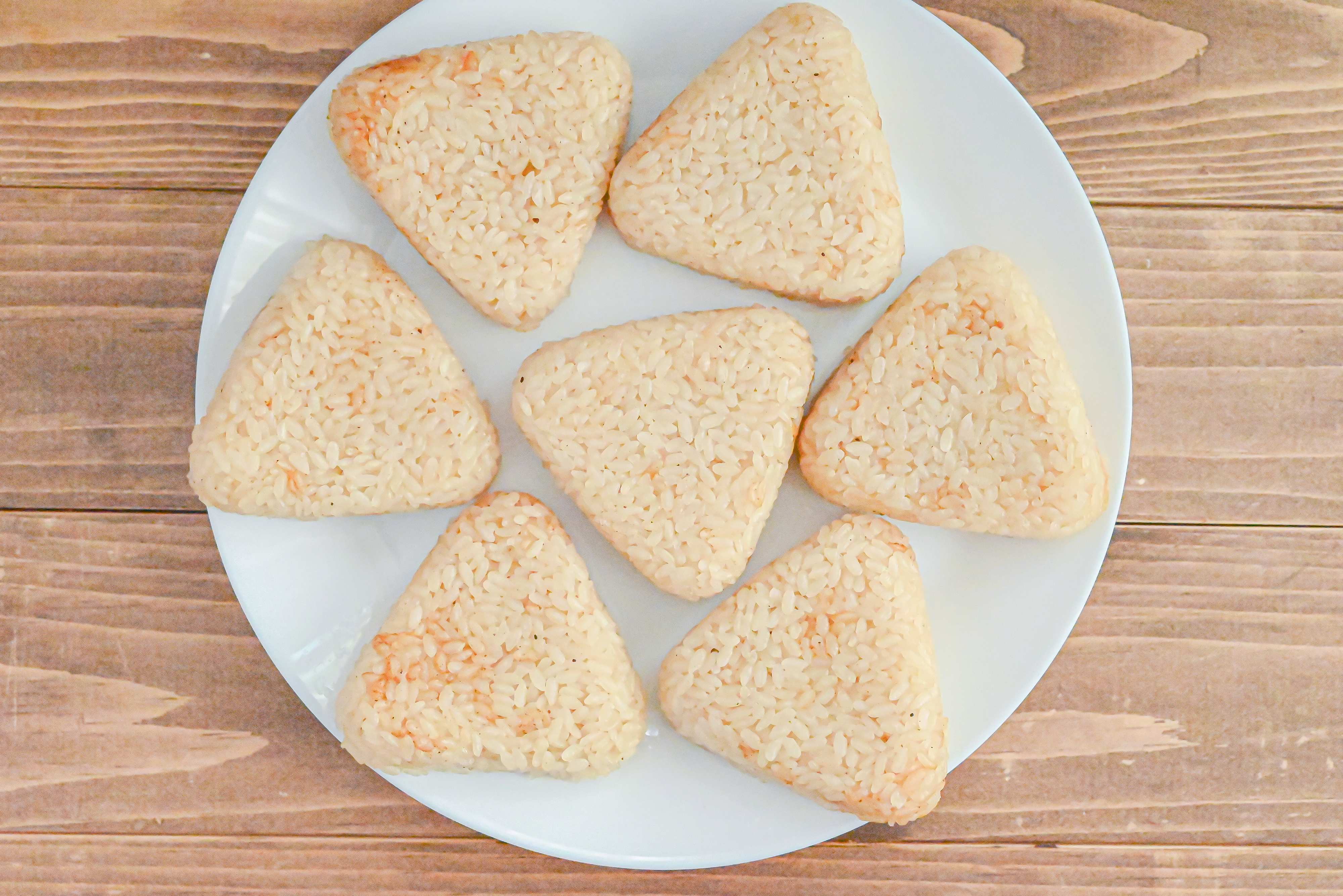 (2)通常炊飯し、しゃもじで全体を混ぜ、食べやすい大きさの三角のおにぎりを作り、5分置く。