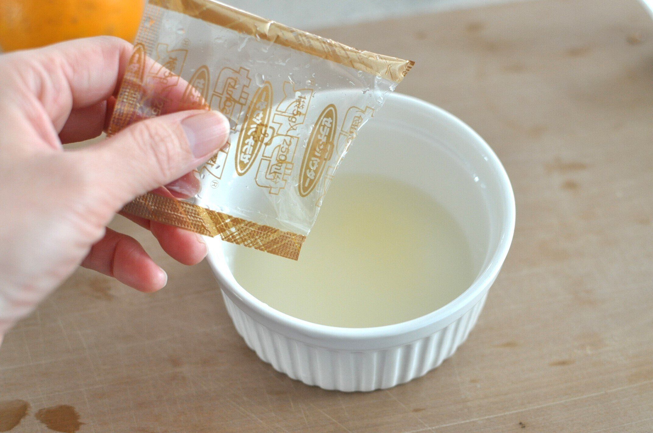 最初にこの作業をしておけば、オレンジの下処理をしている間にふやかせます。