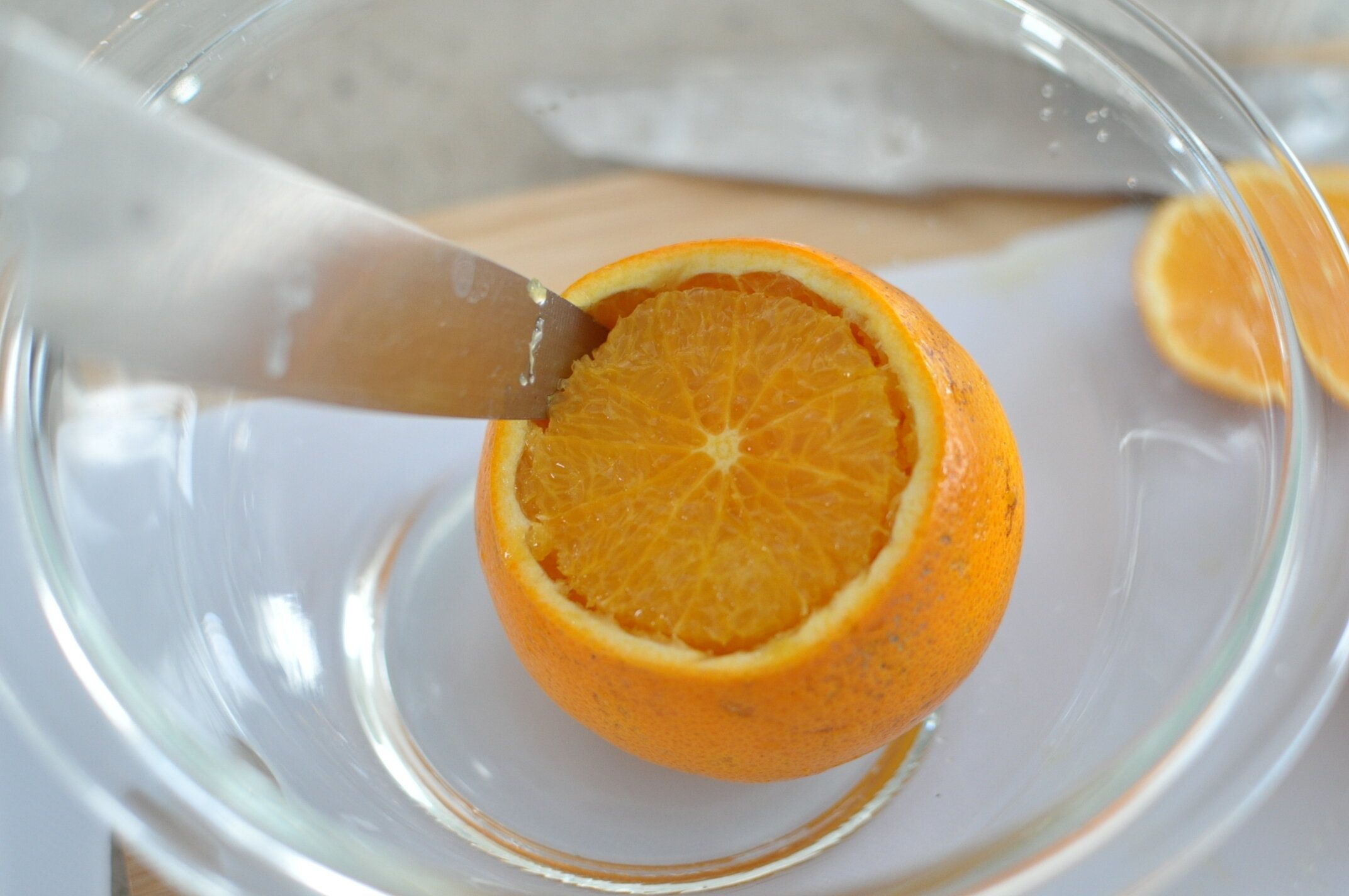 オレンジの上の方をまっすぐ切ります。カップにするので、半分カットではなく、上1/4~1/5くらいのところで切ります。