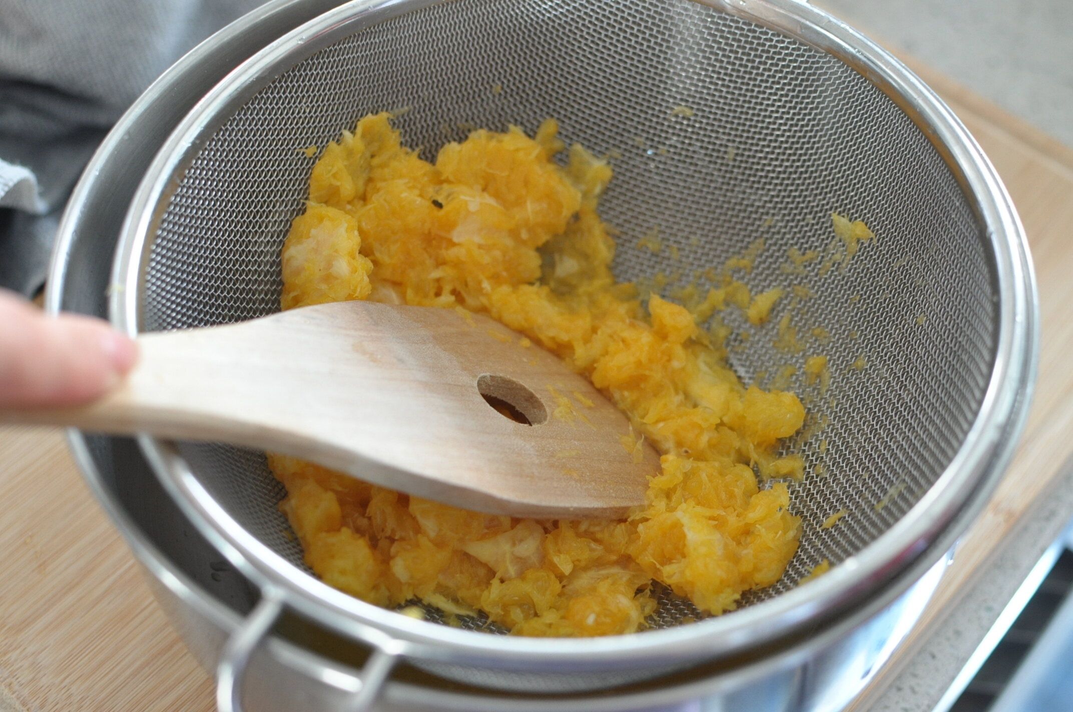 ざるでこして、果汁を取り出します。こすことで、なめらかな食感のゼリーができます。