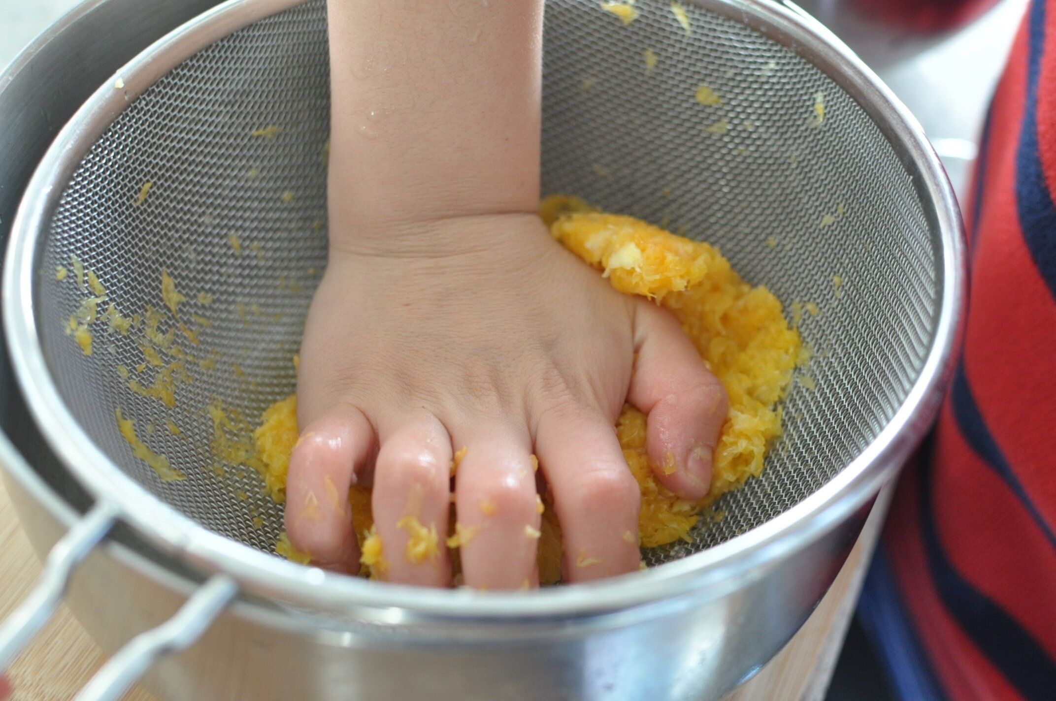 最後はこんなふうに手で押すくらい、ギュッとしぼり切るとたくさん取れます。(我が家では、この作業はいつも息子がします!)
