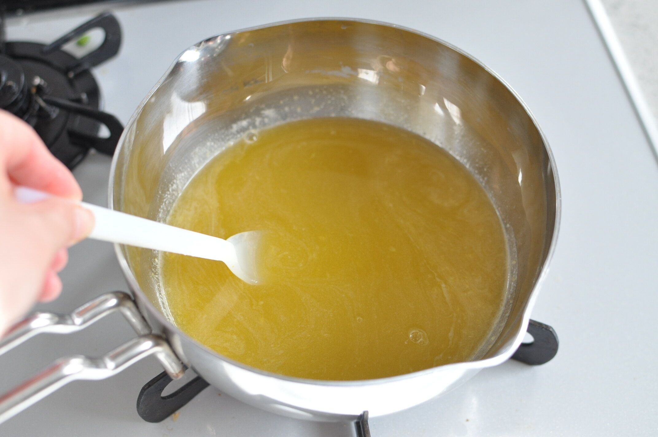 沸騰直前で火を止め、ふやかしたゼラチンを加えてよく混ぜます。