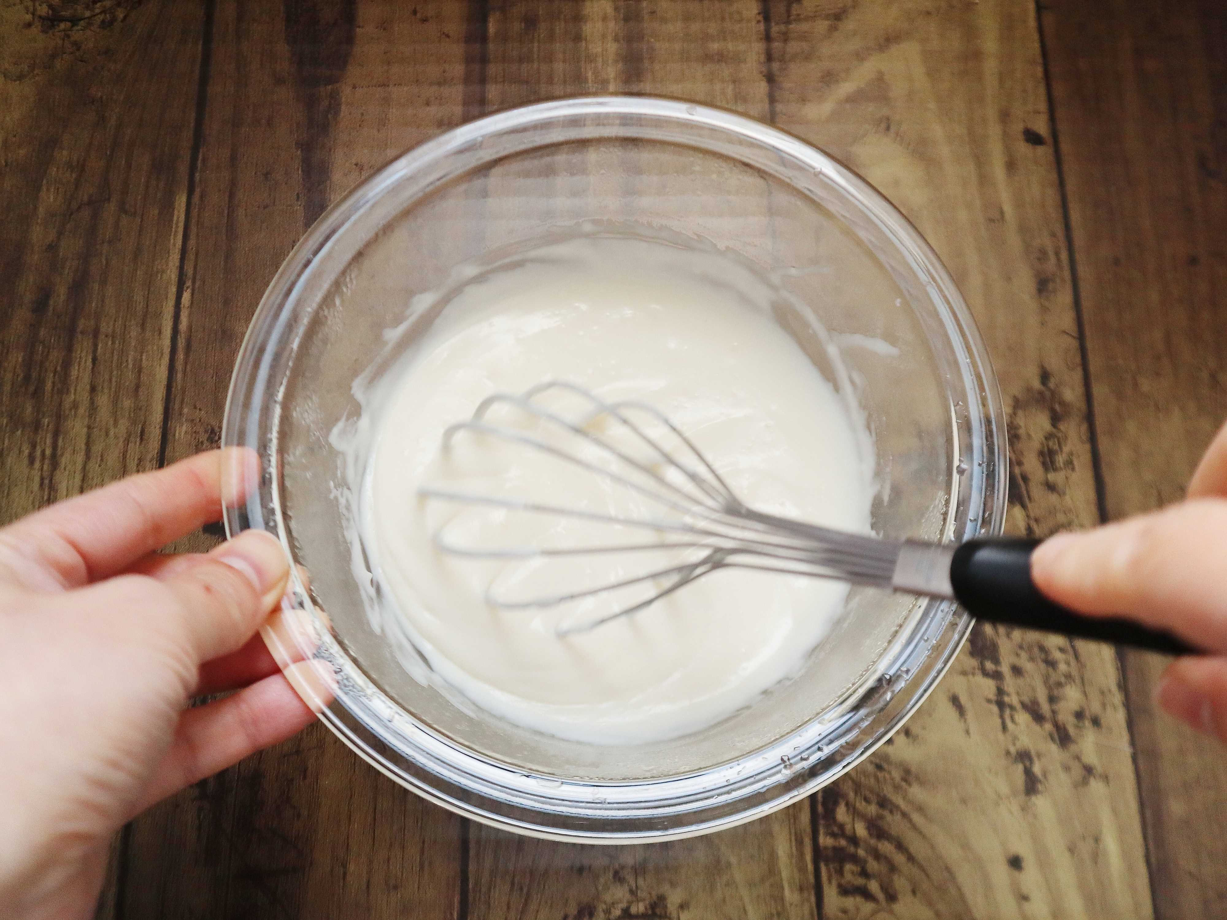 (3) 牛乳を3回くらいに分けて加え、その都度よく混ぜる。