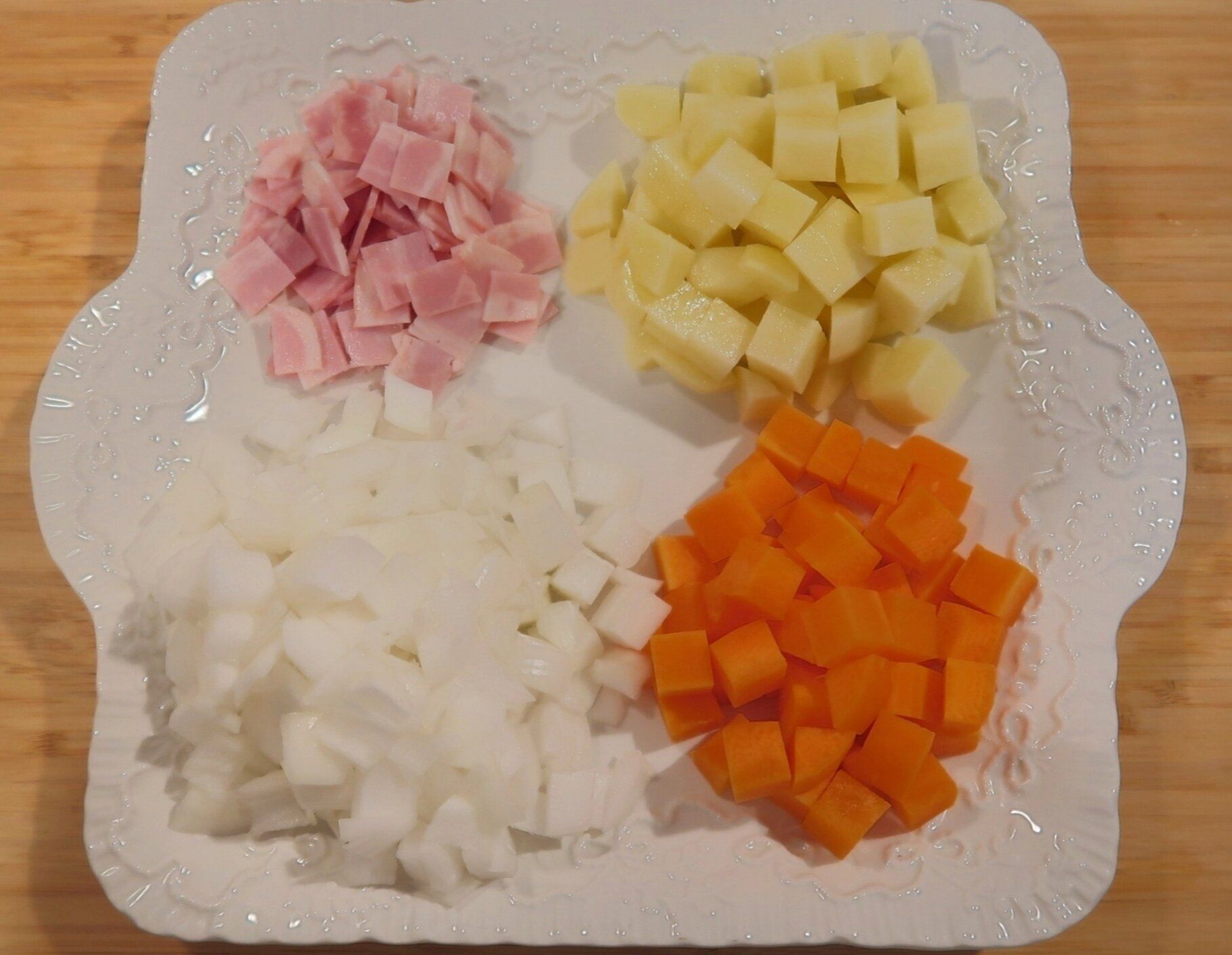 野菜とベーコンは、それぞれ約1cm角にカットします。