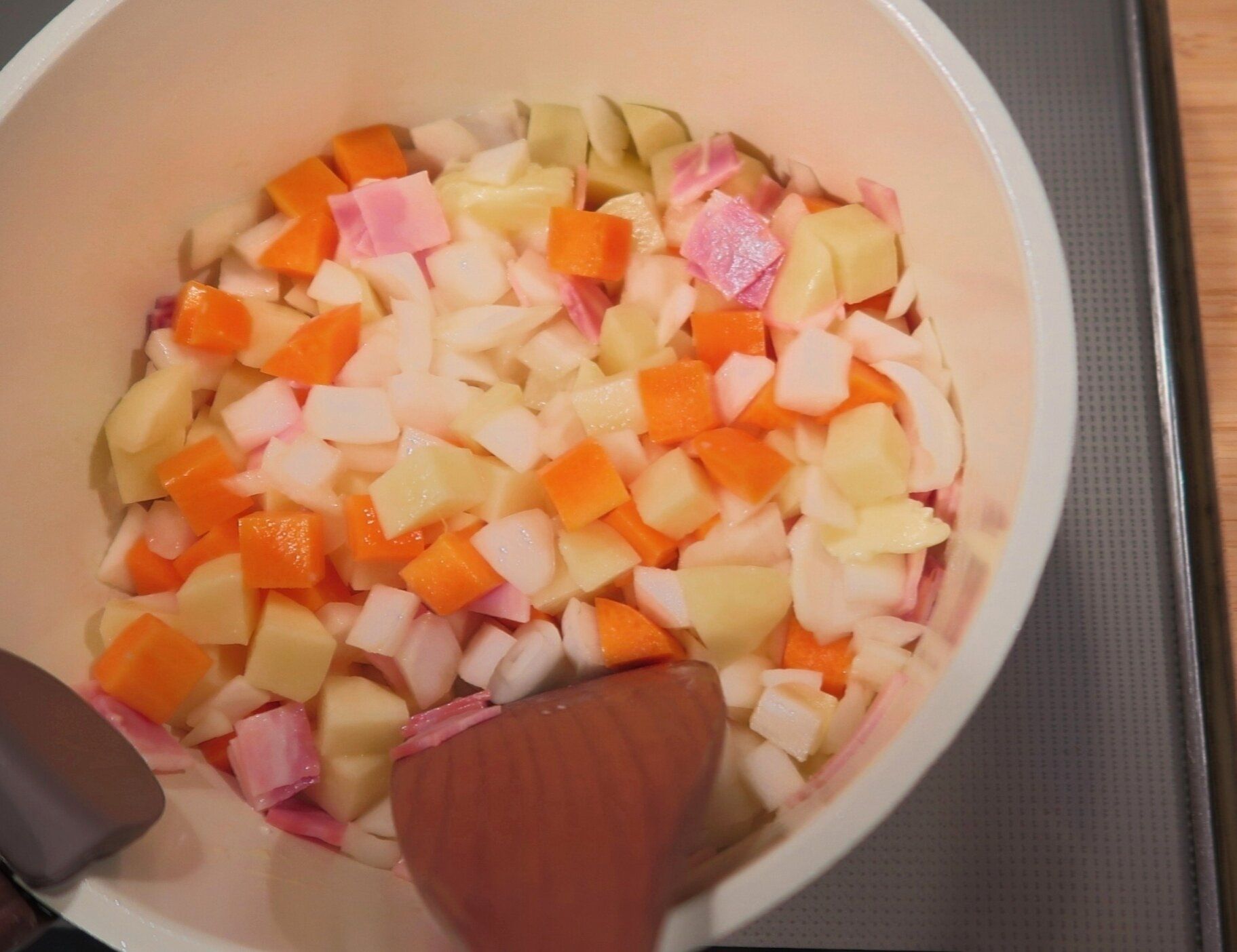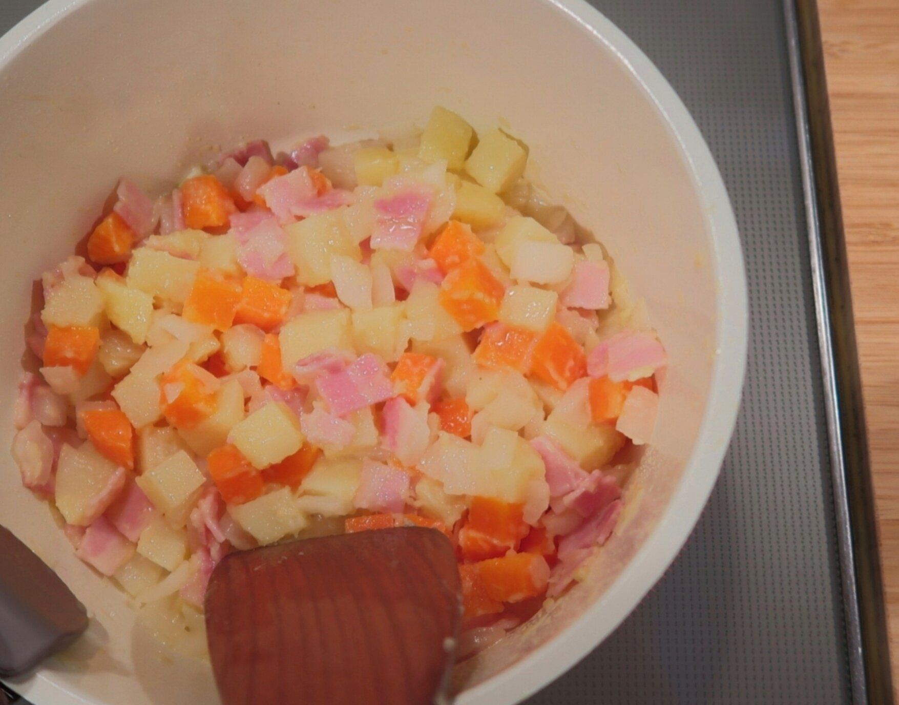 鍋にバターを中火で熱し、カットした野菜とベーコンを加え約5分炒めます。じっくり炒めることで、具材の旨味を引き出します!