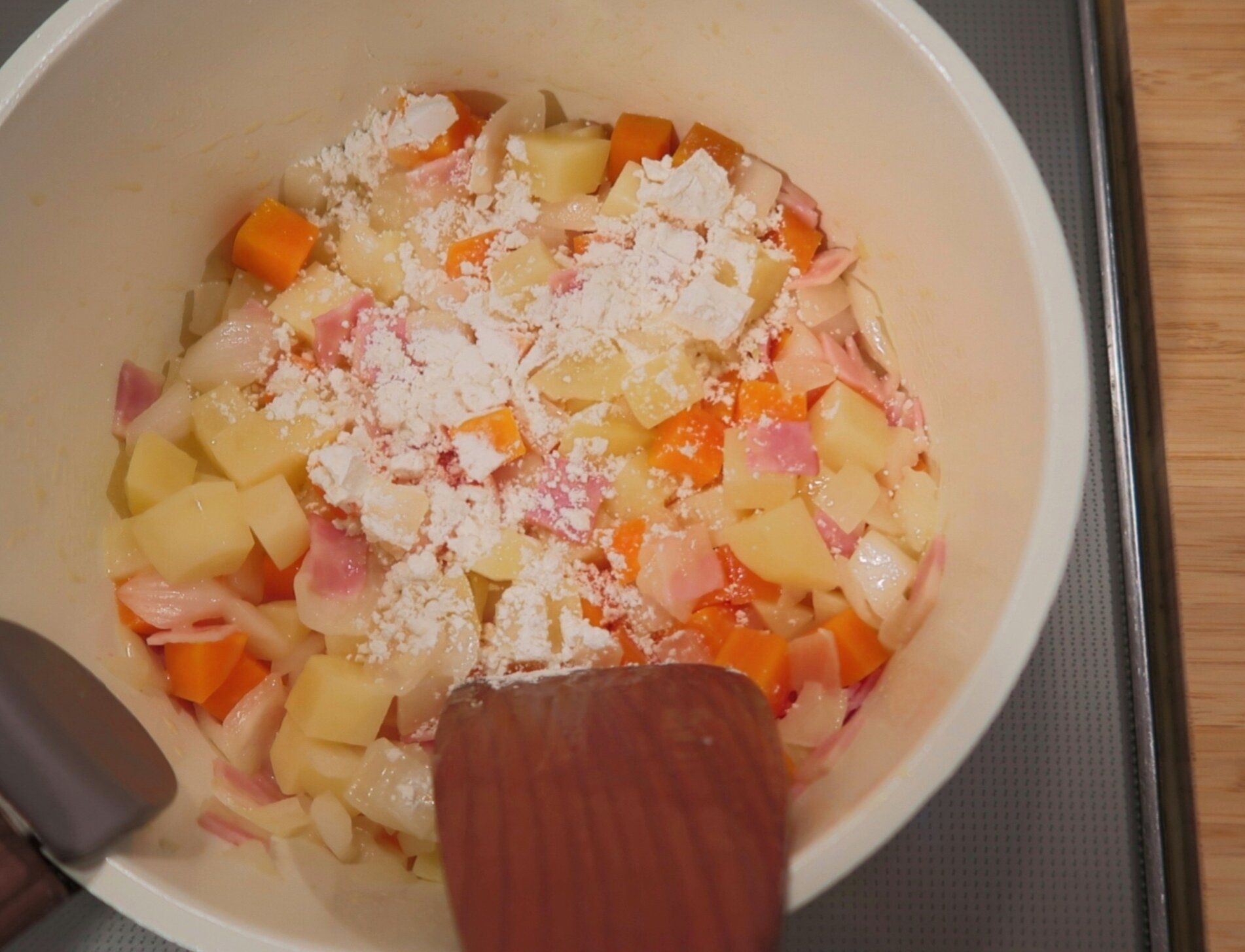 玉ねぎが透き通りしんなりしたら薄力粉をふり入れ、弱火で約2分炒めます。