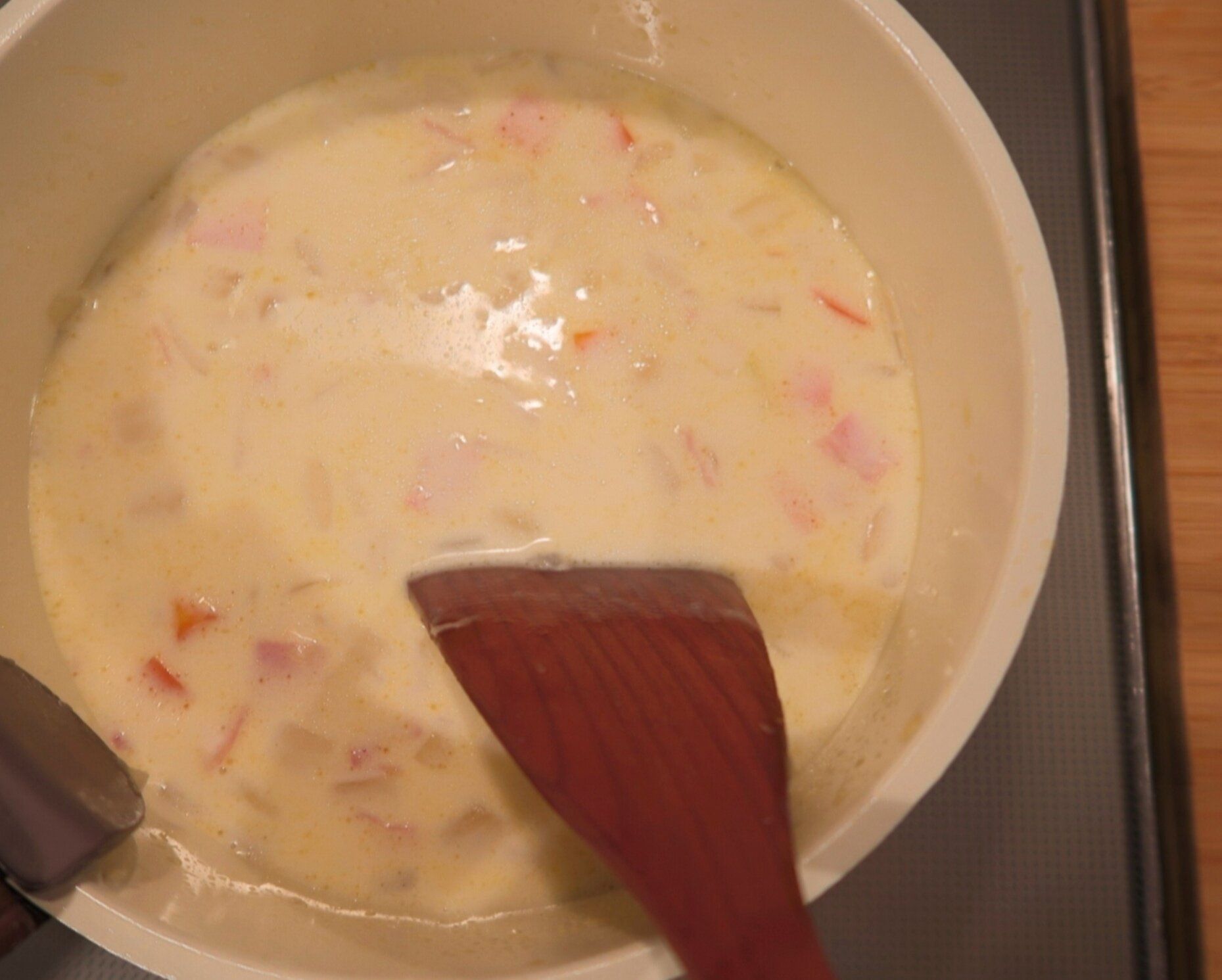 つづいて牛乳(400ml)を2回に分けて加え、そのつど混ぜ合わせます。コンソメキューブを加え、強めの中火で沸騰直前まであたためてから弱火にし、ふたをしてときどき混ぜながら約15分煮込みます。