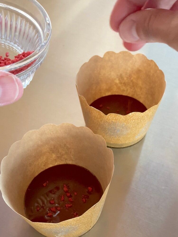 3.型に入れ、上にお好みのトッピングを散らし、冷蔵庫で冷やす。型は何でもOK。中途半端に余ったカップケーキの型や、お弁当のおかず用カップでも。チョコの量を少しにして薄く仕上げると、取り出す時に割れやすくなるので、厚さ1cmほどになるように作るのがオススメです。