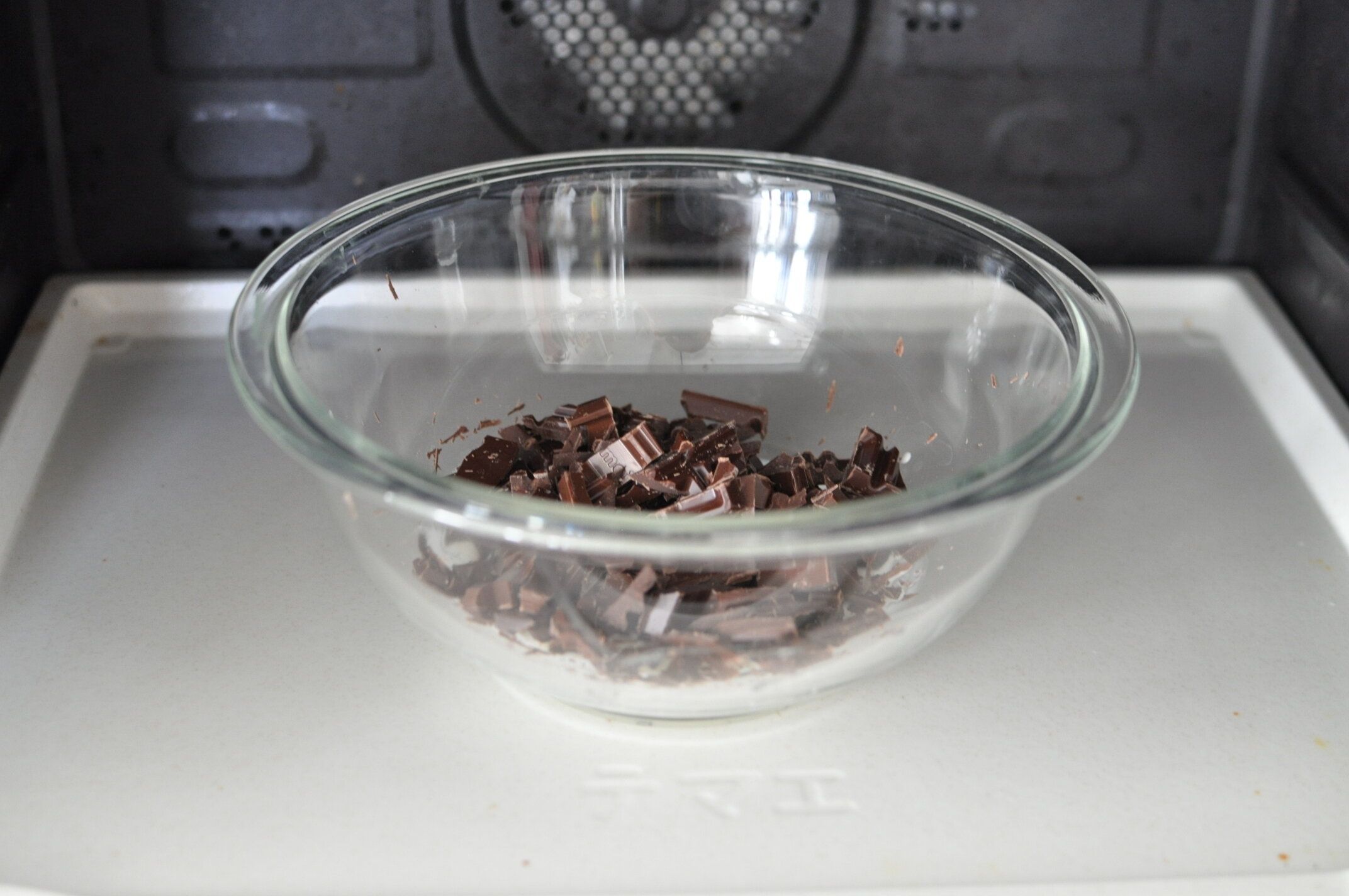 耐熱ボウルに、生クリームと刻んだチョコを入れて、電子レンジ600Wで50秒~1分加熱します。