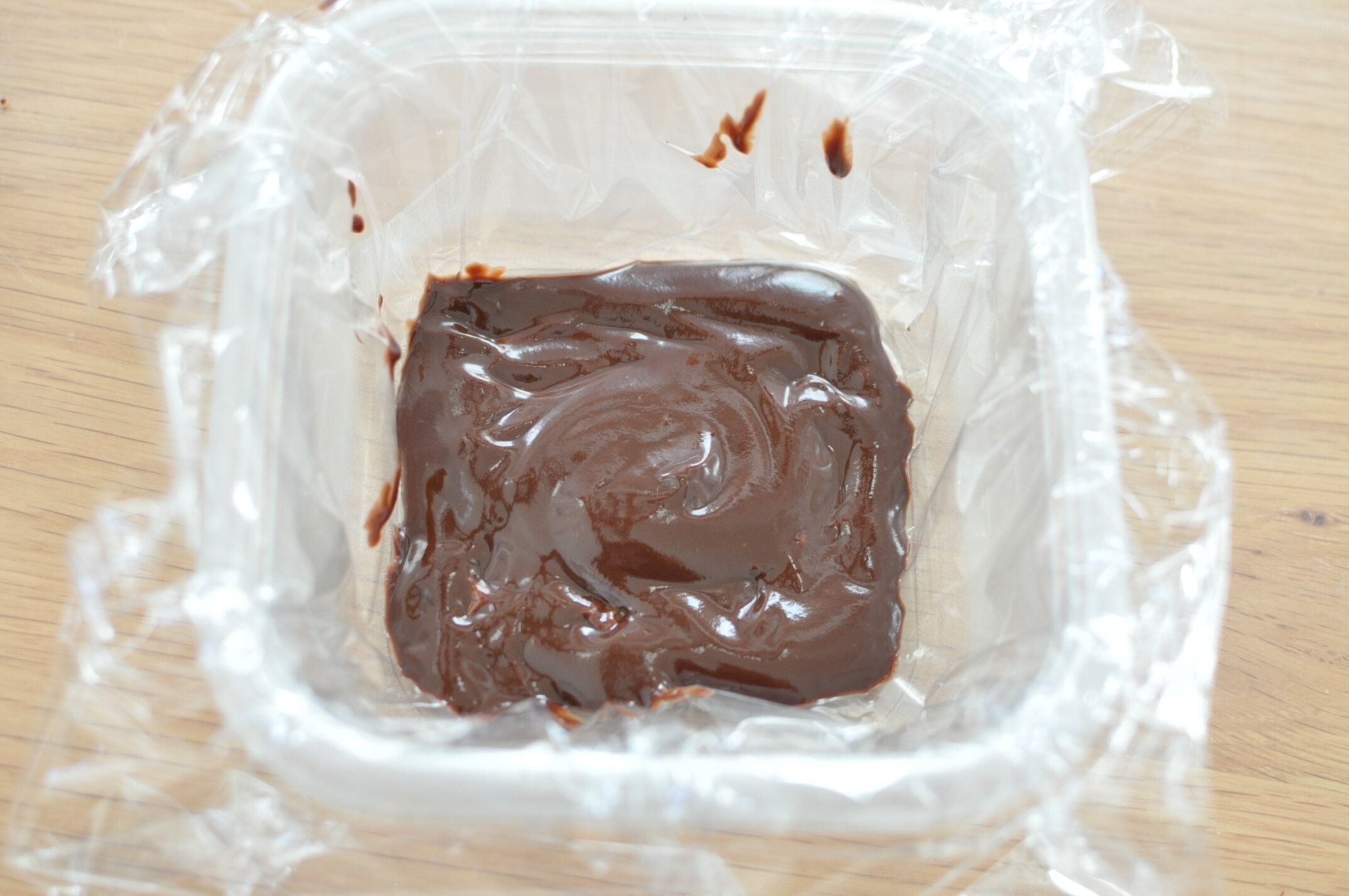 ラップを敷いたタッパーに、チョコレートを1/3量入れて平らに広げます。