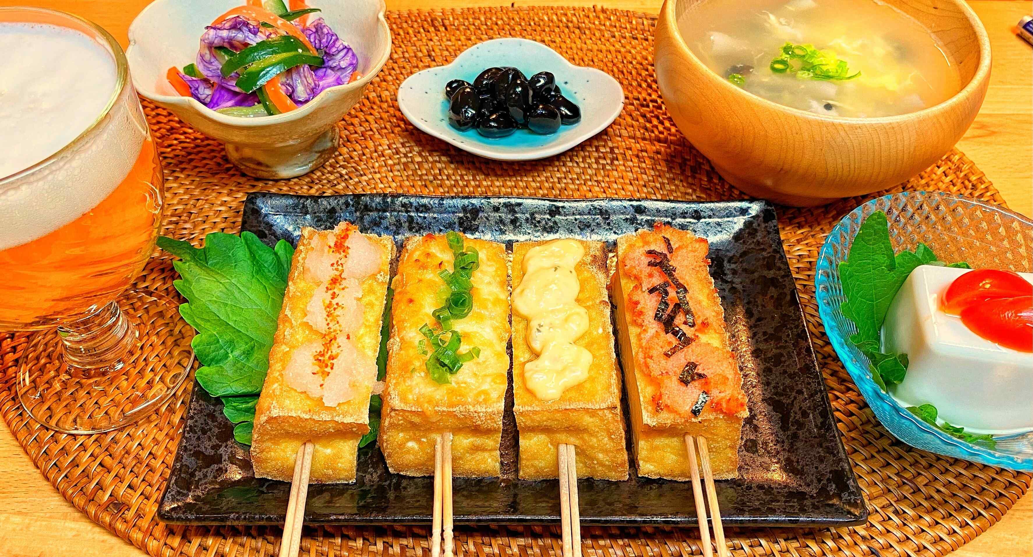 お好みのトッピングで見た目も味も楽しめる田楽風の厚揚げです。