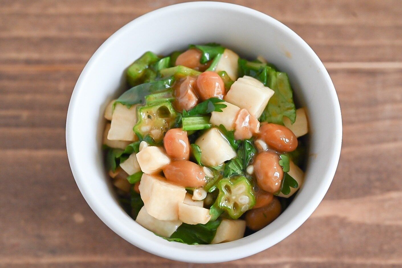 納豆、オクラ、長芋、3つのネバネバ食材にパクチーをからめていただきましょう。