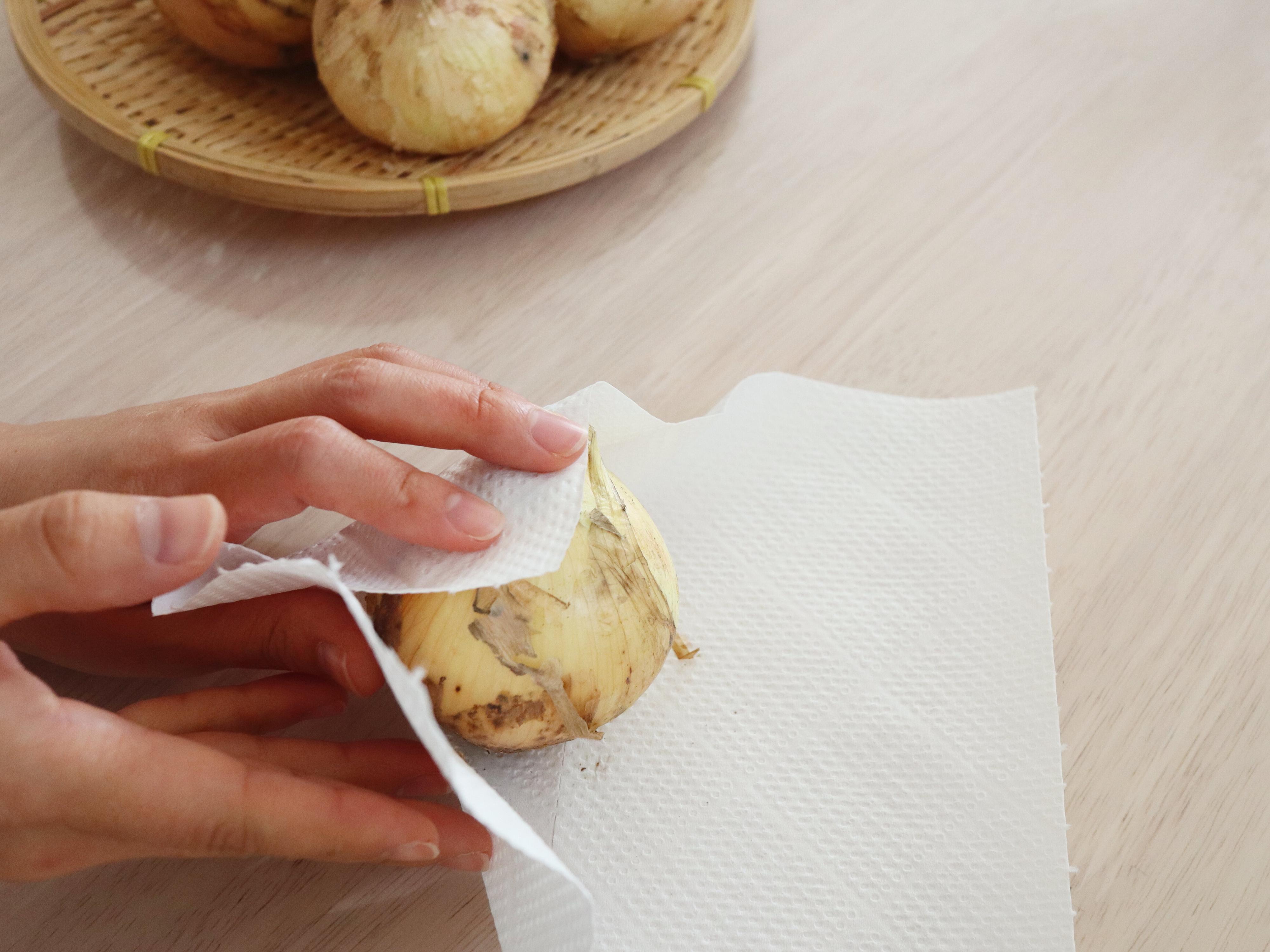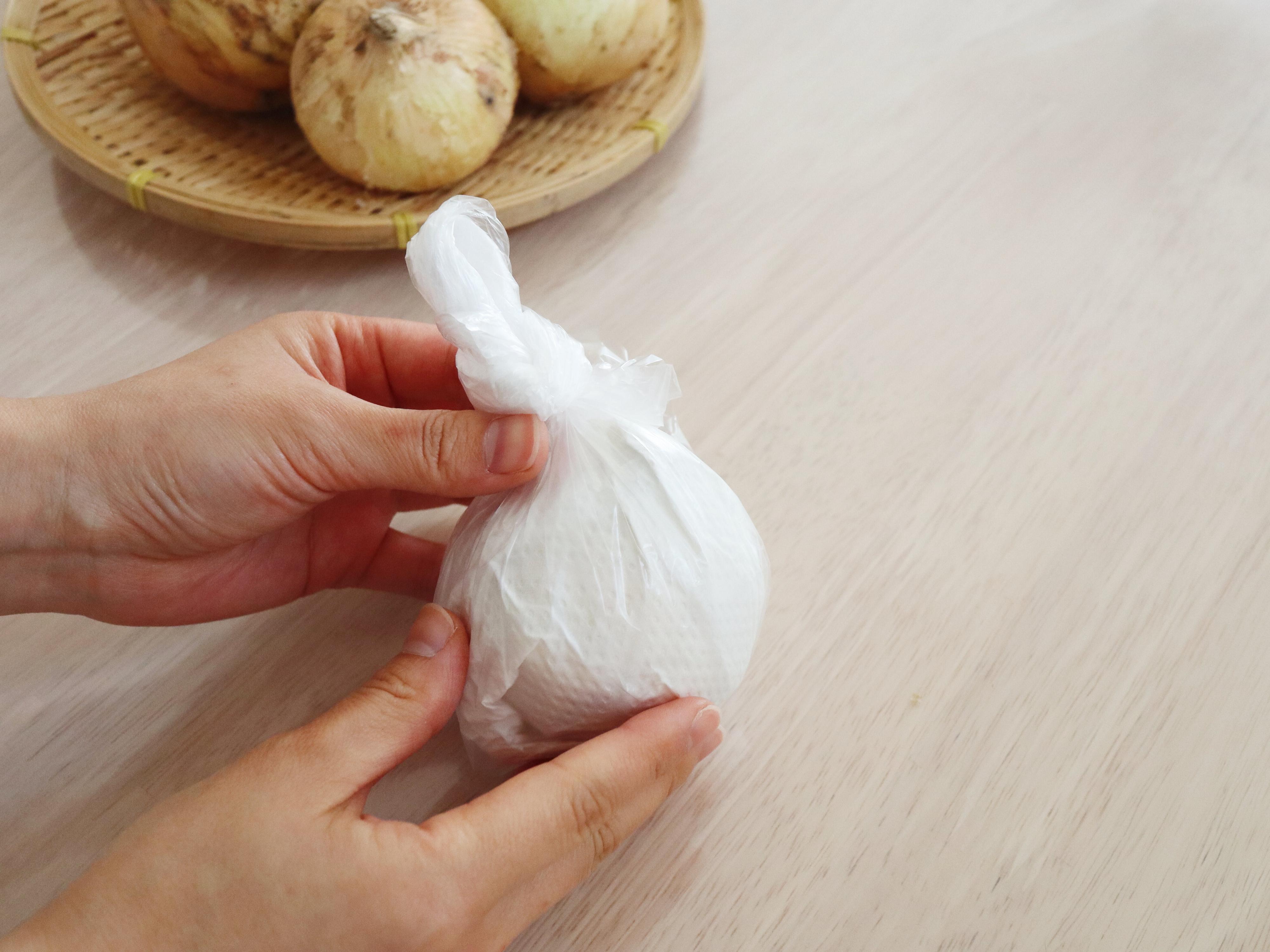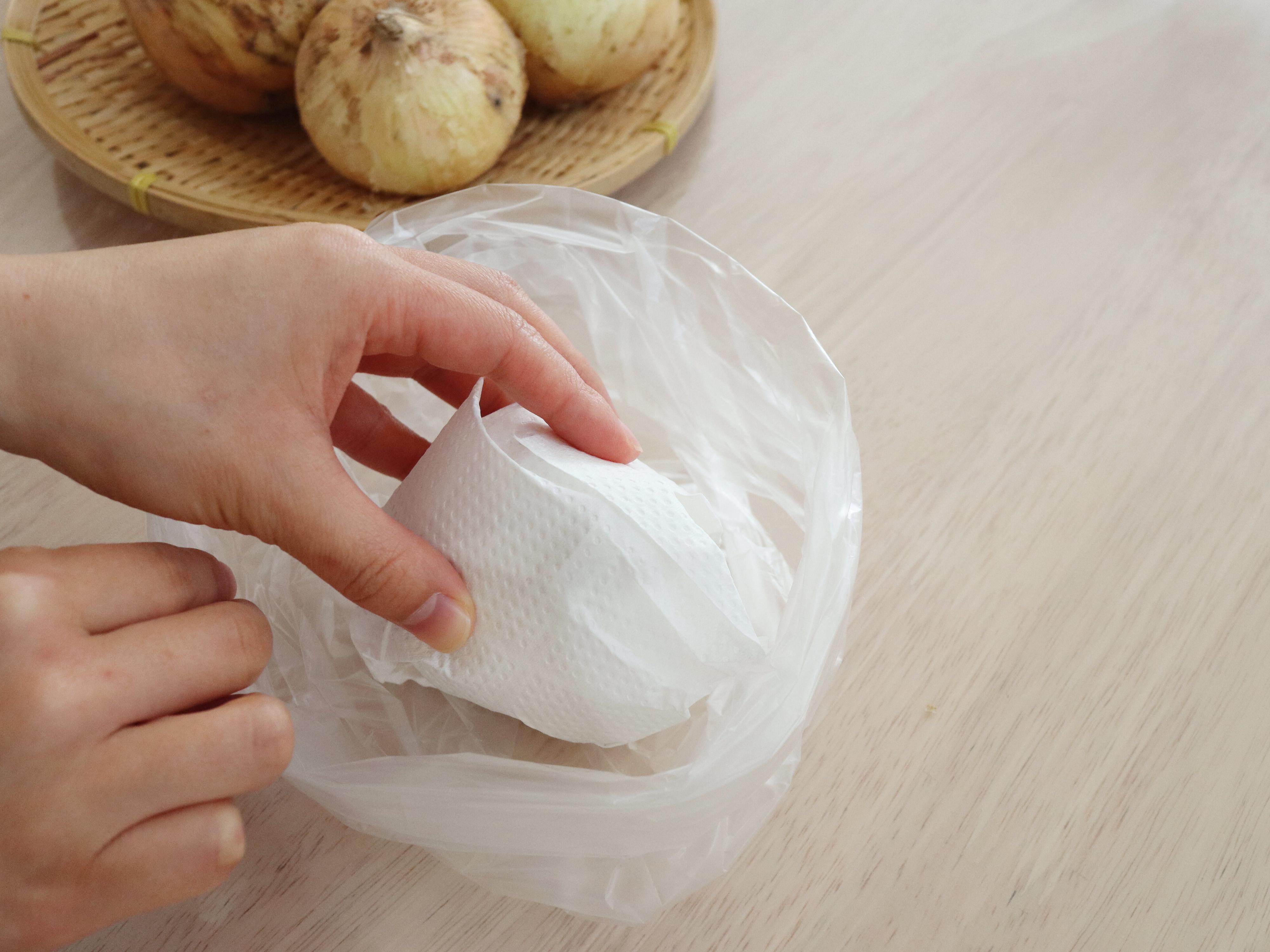 キッチンペーパーで包んでポリ袋に入れるひと手間がありますが、これだけでより長くおいしい新たまねぎを楽しむことができるようになります。