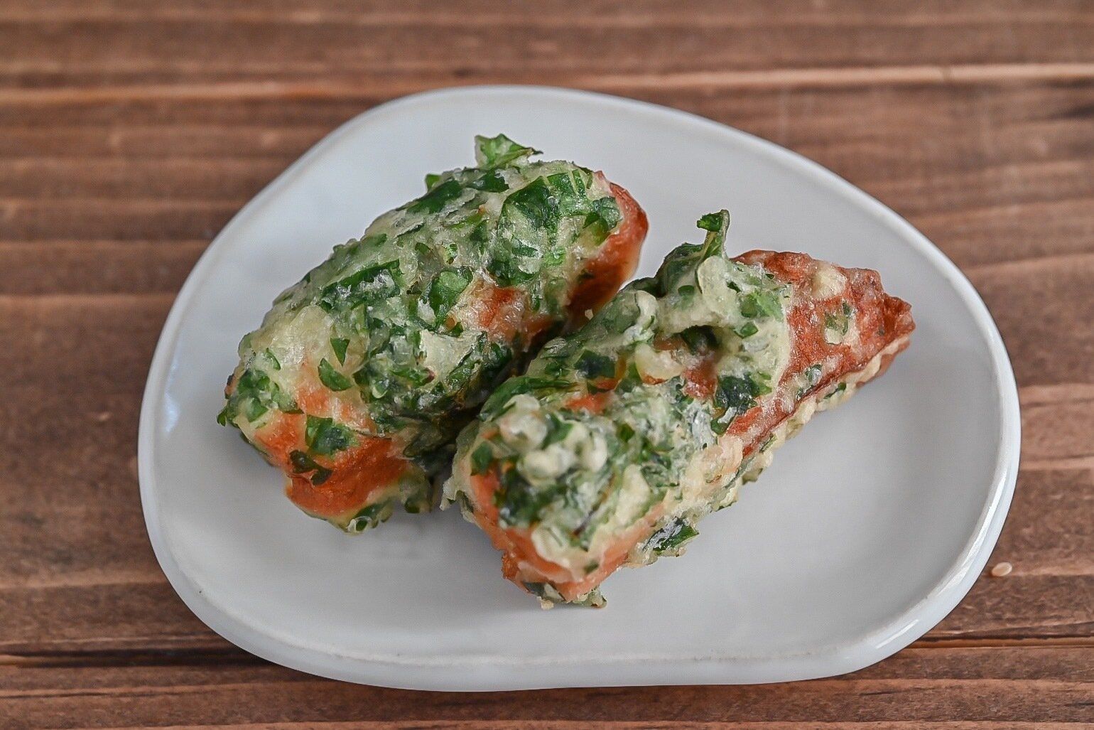 ぱっと見た感じは磯部揚げのようですが、のりではなく、パクチーの衣をまとったちくわの天ぷらです。
