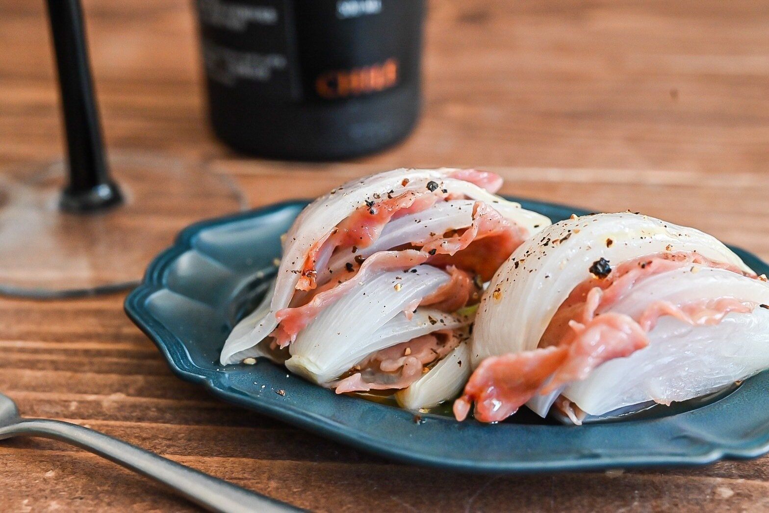 (1)新玉ねぎを大きめのくし切りにし、新玉ねぎの間に生ハムをはさみ入れる。