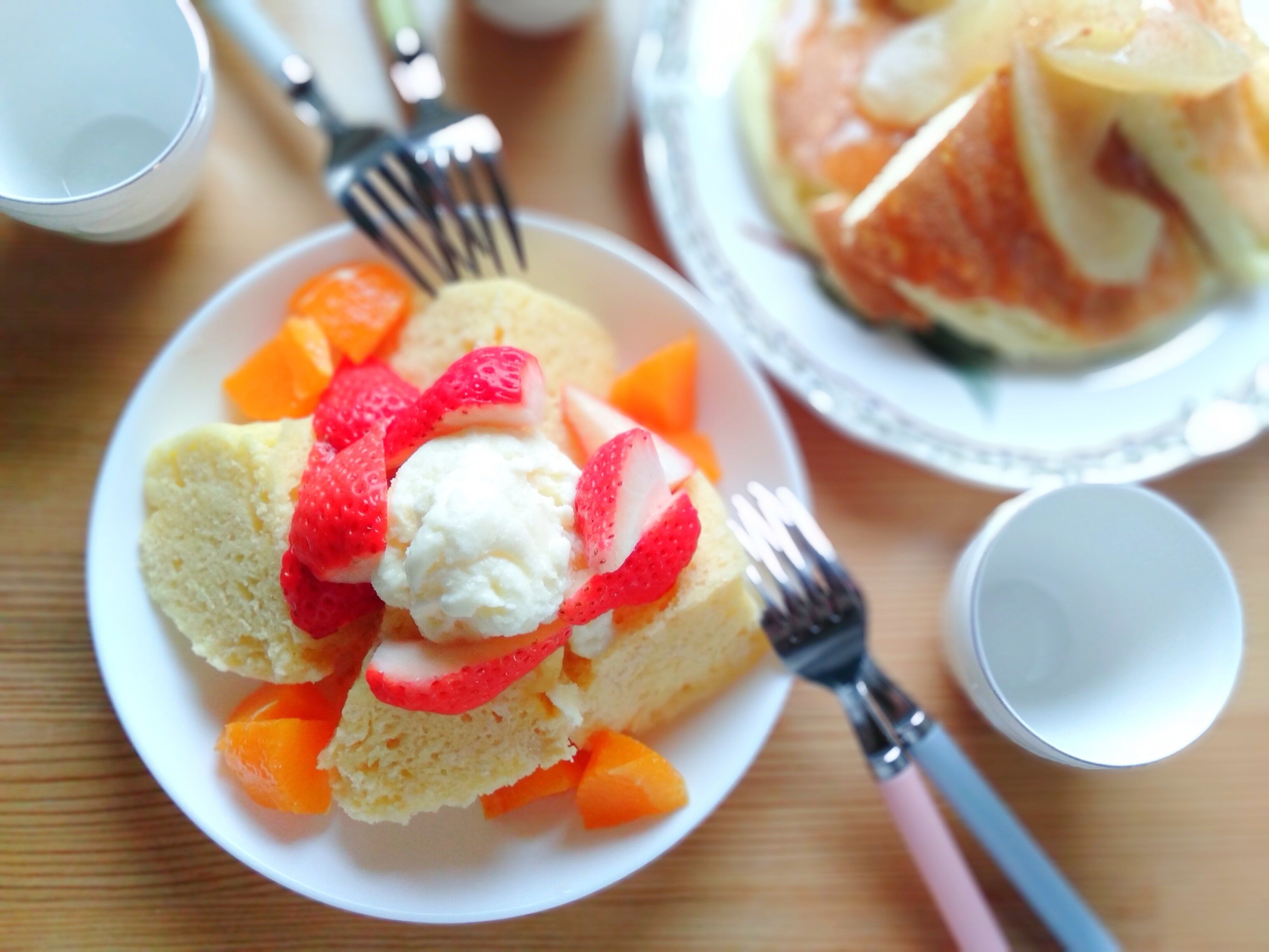 生クリームを泡立て、果物を添えて、子どもたちも大喜びのデザートがラクにできあがりました。