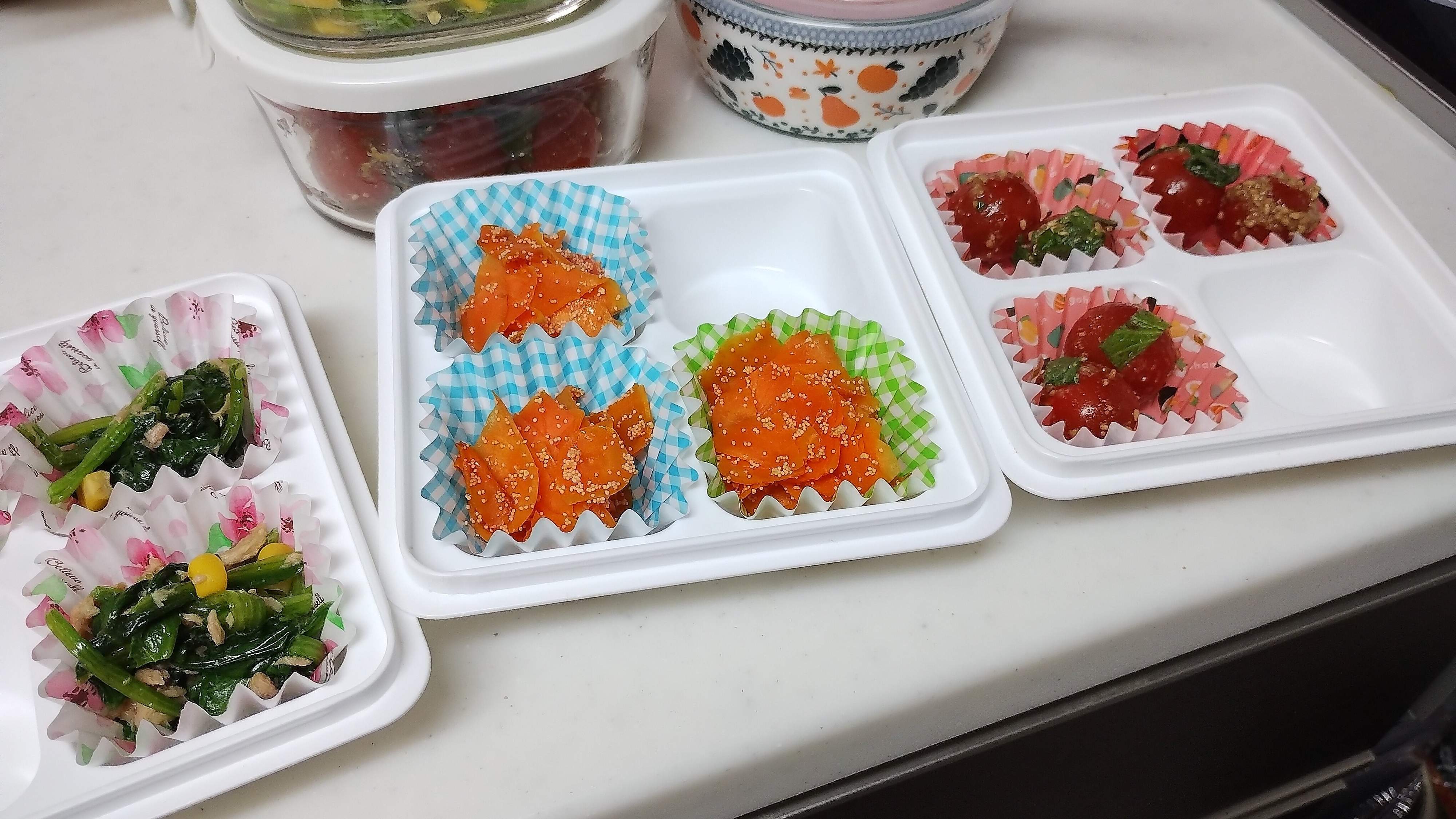 お弁当の副菜は3種作り置きをしています。2~3日で食べきれるように週2回調理しています。