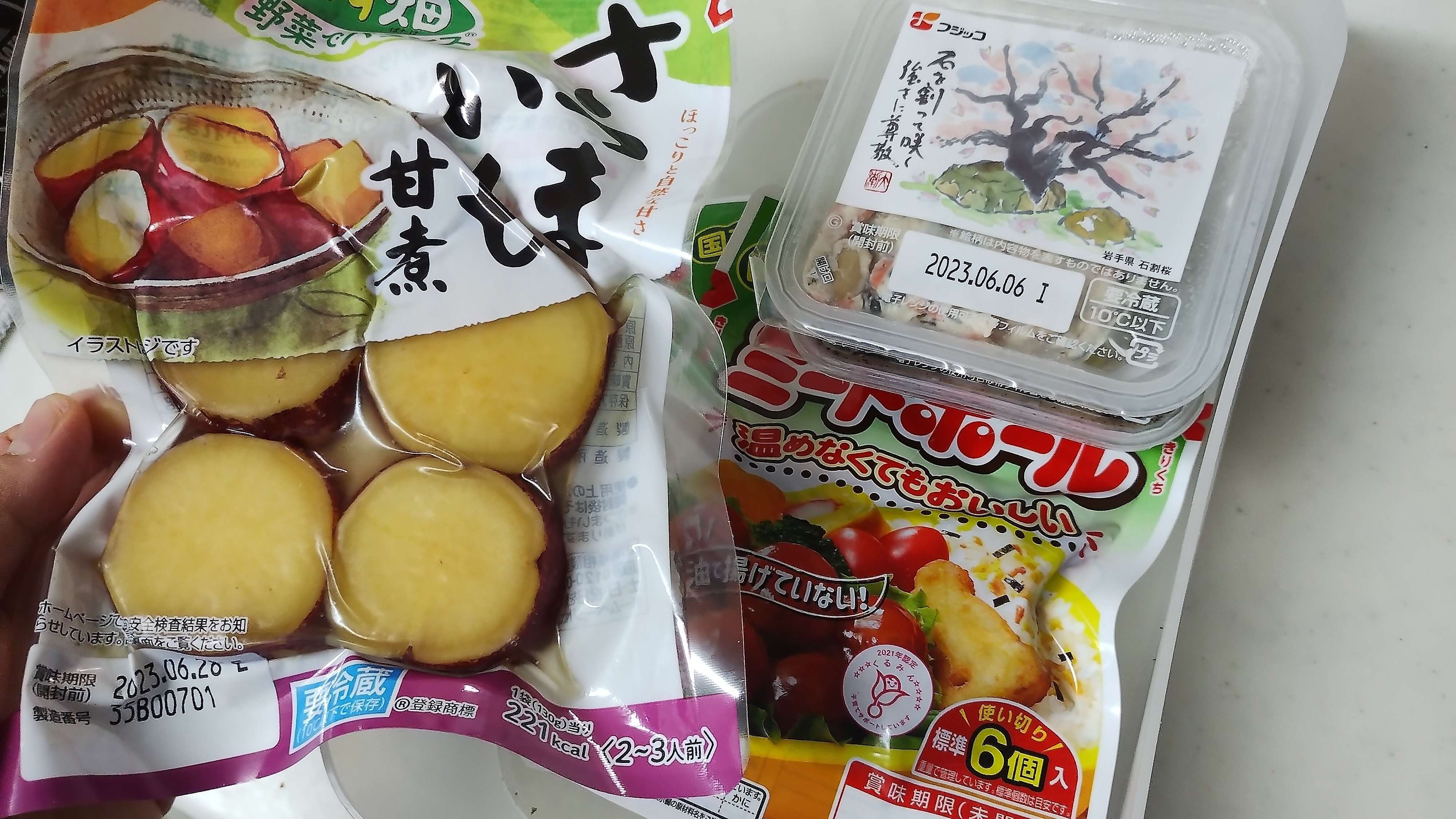 市販品はミートボールや、さつまいも、ひじきの煮物など数種類ストックしています。
