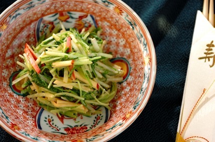 ゆでた水菜と皮つきのまま切ったりんごのシャキシャキ食感がアクセントになる、和風サラダです。こちらは、緑と赤の対比が鮮やかに映えます。
