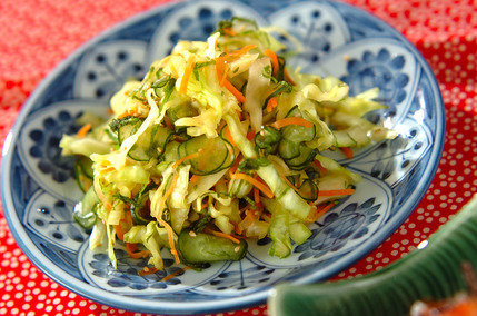 キャベツ、にんじん、大葉、きゅうり、ゆず皮を使った、心地よい食感が楽しめつつ見た目にも鮮やかな一品です。