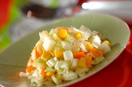 キャベツ、にんじん、コーンを刻んで調味料と和えてつくる、コールスローです。シャキシャキとしたキャベツの食感と、ほどよく酸味のきいた味付けでさっぱりと食べられます。脂っこい料理だけでなく、甘辛い味の料理の付け合わせにおすすめです。