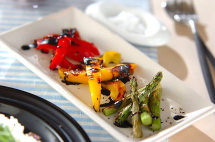 このレシピでは、色の異なるパプリカとアスパラガスの鮮やかさが、食卓に華を添えてくれるます。焼き目が付くまでグリルで野菜を焼き、オリーブオイル、煮詰めたバルサミコ酢、粗びきこしょうを振って完成です。